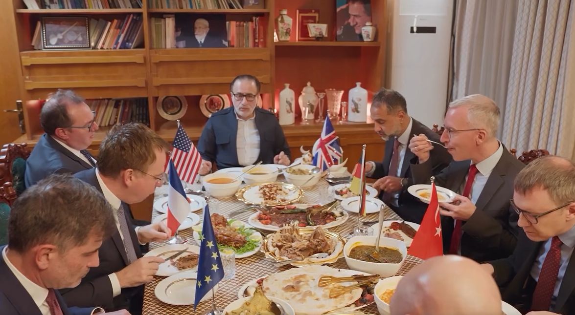 وبموازاة الجدل المتعلق باستخدام الصور المولدة للجواهري والسعيد، تفجر جدل آخر على خلفية ظهور القائم بأعمال السفارة الأميركية جوشوا هاريس، والسفير البريطاني عرفان صديق، والسفير الفرنسي باتريك دويل، والسفير الألماني دانيال كير، خلال مأدبة طعام، وبدا أنهم كانوا بضيافة فرهاد علاء الدين، مستشار رئيس الحكومة العراقية للشؤون الخارجية.
