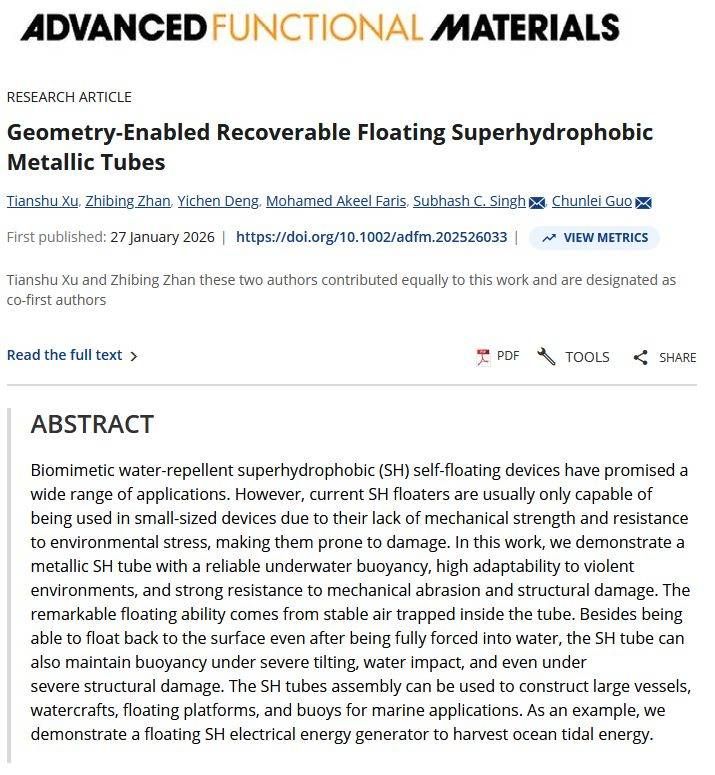 وقال الدكتور غو إنه أراد ابتكار تطبيقات للأسطح فائقة الكراهية للماء أكثر تميّزاً. وقبل بضع سنوات، نشر فريقه العلمي ورقة بحثية تصف بنية عائمة تتكون من قرصين متوازيين من الألمنيوم فائق الكراهية للماء، متصلين بعمود بلاستيكي. وقد منعت الأسطح فائقة الكراهية للماء تدفق الماء إلى الفجوة الضيقة، ما حافظ على طبقة من الهواء بين القرصين.