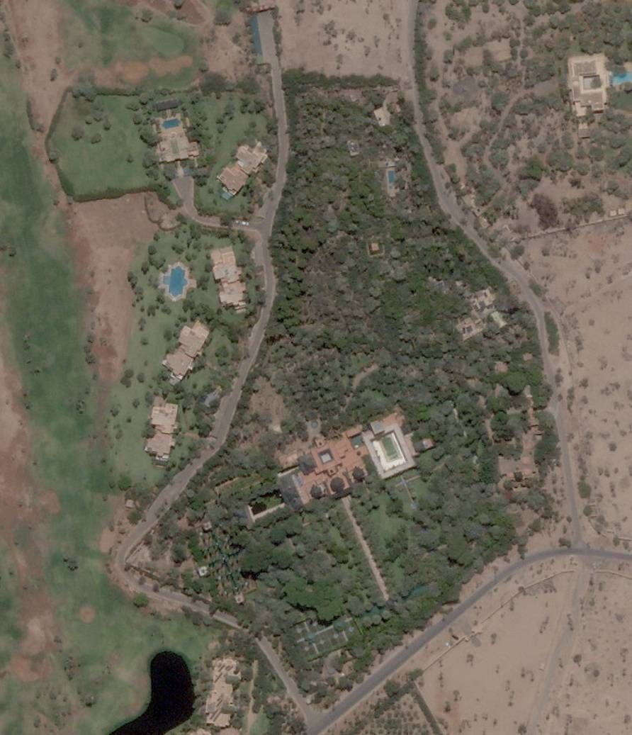 وتشير قائمة عقارات ضمن ملفات وزارة العدل الأميركية إلى أن القصر تبلغ مساحته 4.6 هكتار، ويضم جدرانا مذهبة وحمام استجمام بالبخار و60 نافورة رخامية ومسبحا مكشوفا وحوض جاكوزي. كما يضم القصر عدة حدائق بها مئات من أشجار الزيتون وأكثر من 2000 شجرة نخيل في مساحة أكبر من حديقة واشنطن سكوير بارك في نيويورك أو حوالي ستة ملاعب كرة قدم.