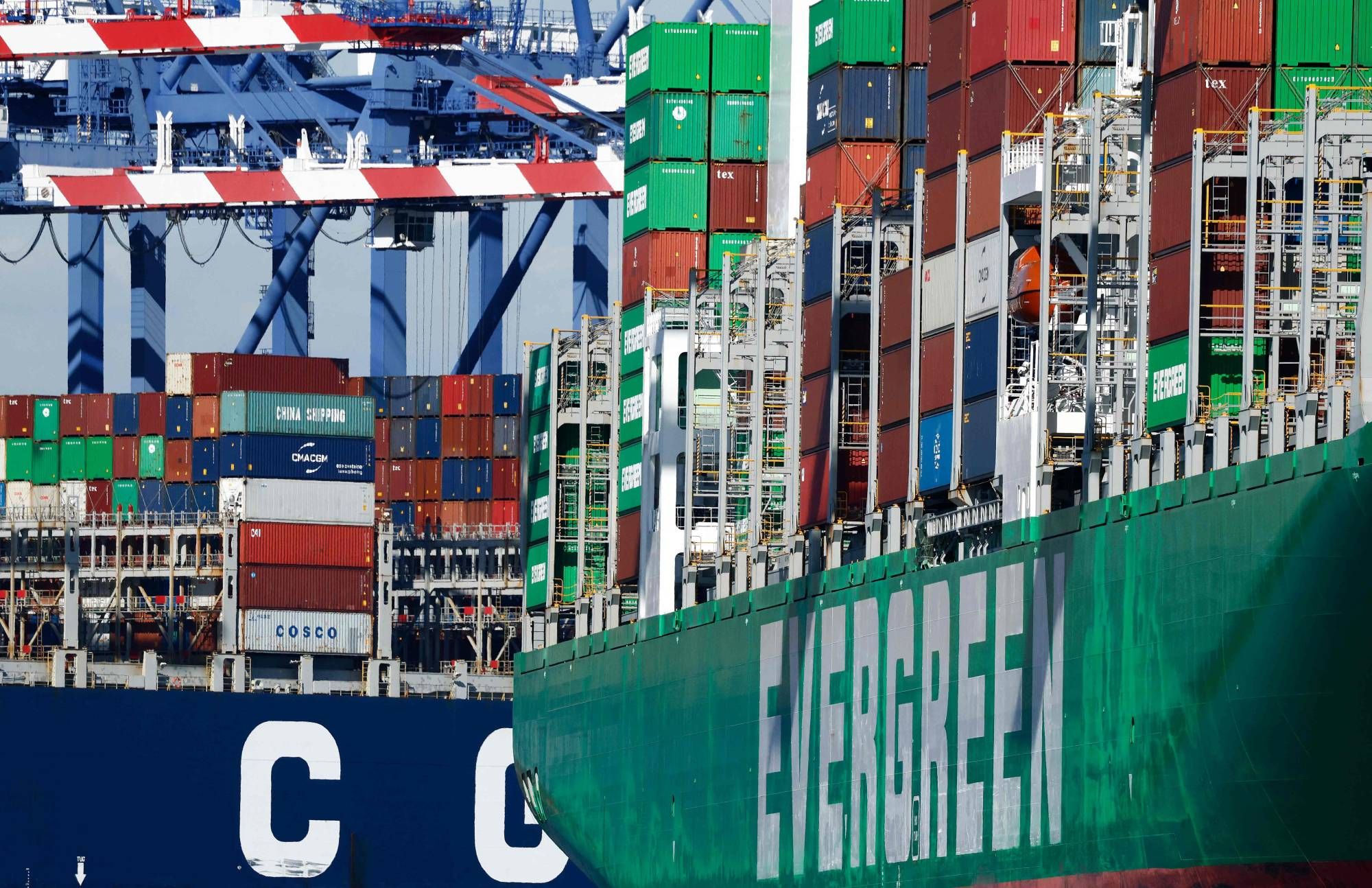 رافعات شحن تعلو سفن حاويات محملة بحاويات في ميناء لوس أنجليس (أ.ف.ب)