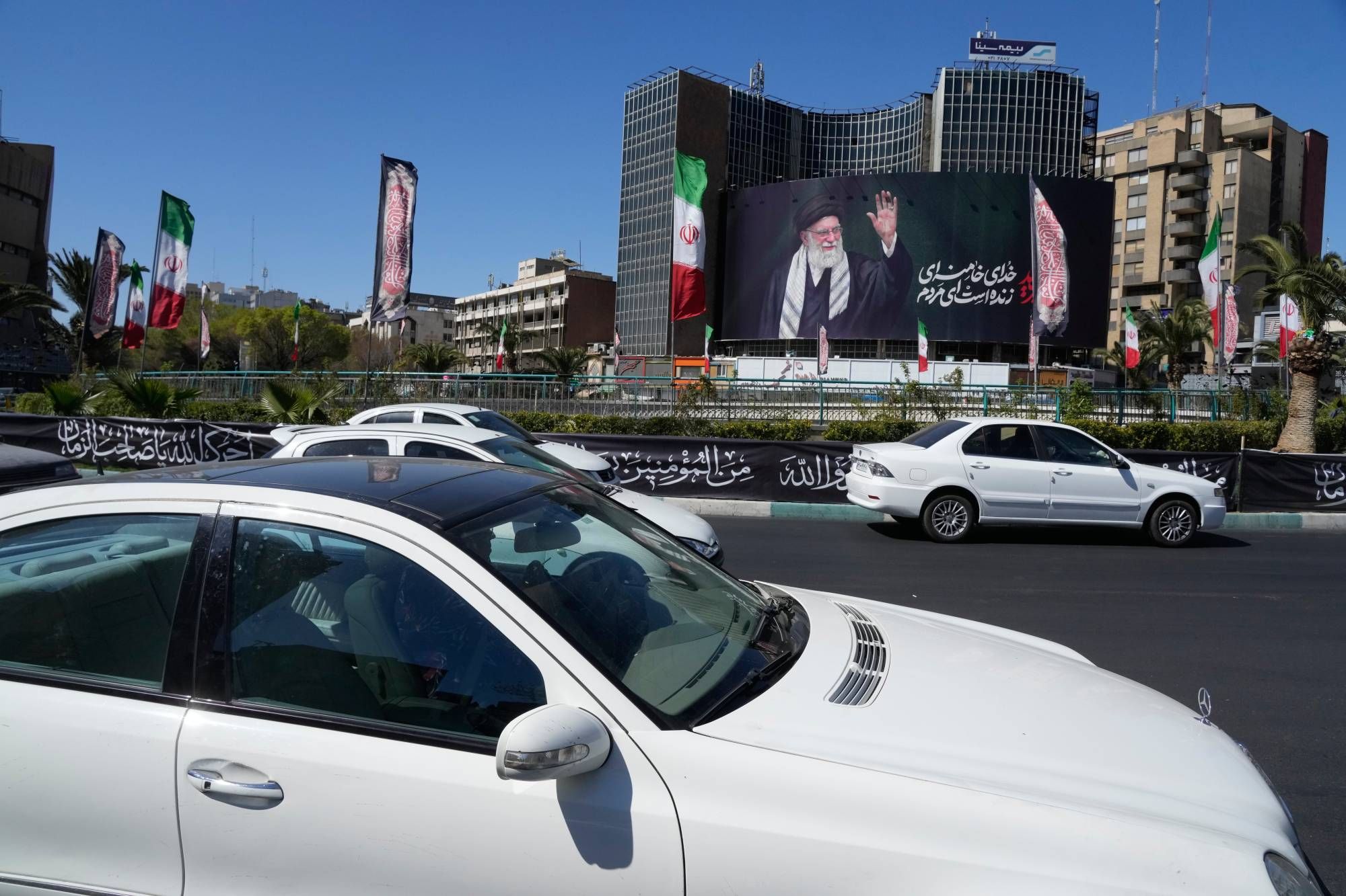 وغير بعيد عنها، لوحة إعلانية ضخمة تغطي مبنى كاملاً عليها صورة المرشد علي خامنئي الذي قُتل في غارات السبت.