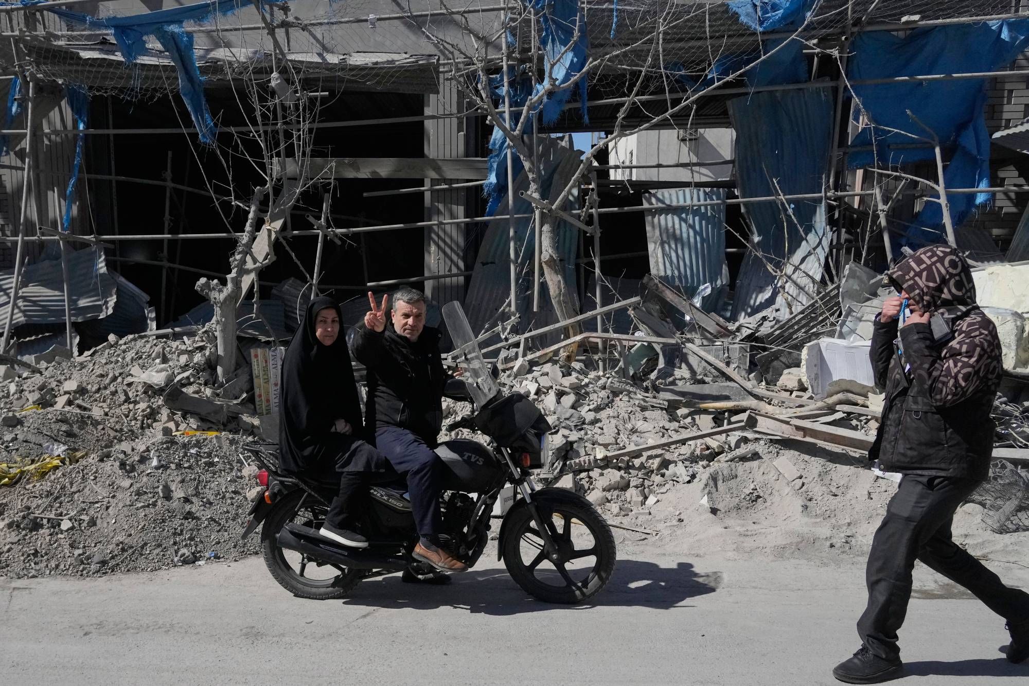 لم يبقَ في ساحة الفردوس، أحد التقاطعات الرئيسية في وسط العاصمة، سوى صف من المباني المدمرة جراء الغارات. ورفع علم إيران بين أنقاضها.