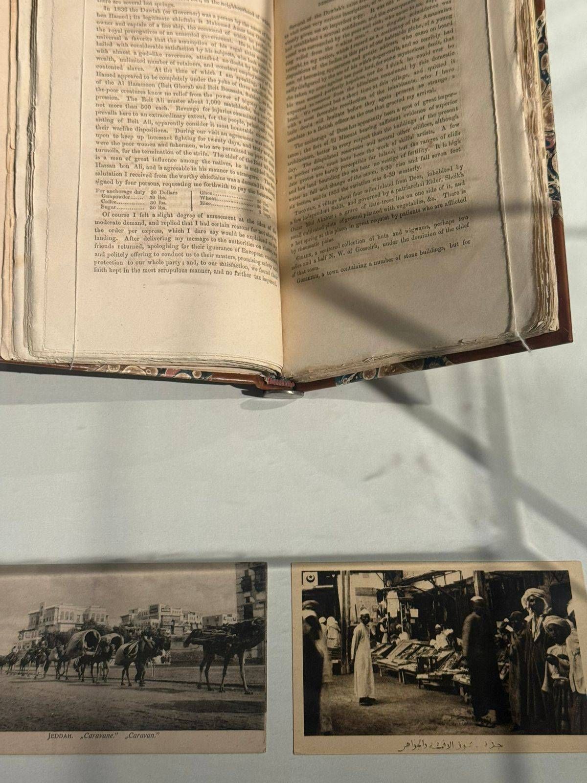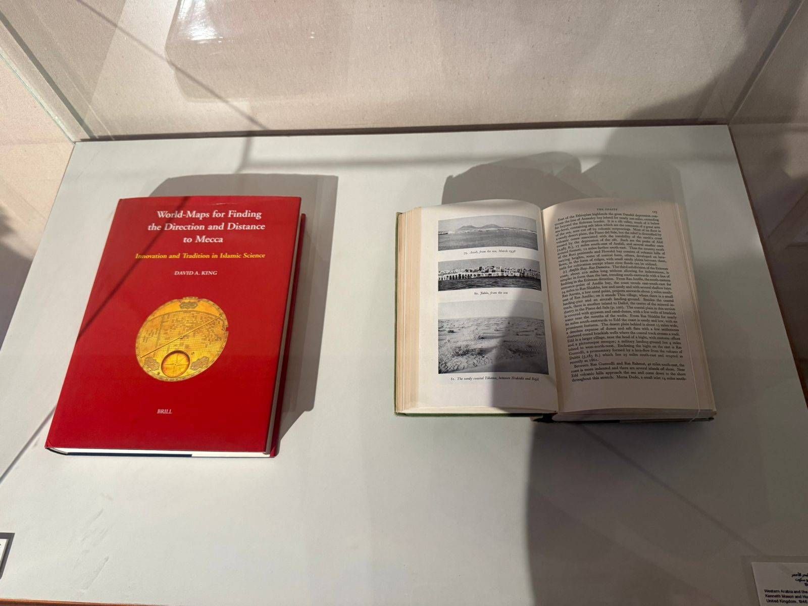 وبالقرب منها، يعرض كتاب يعود إلى عام 1946 يتضمن صورة قديمة لمدينة جدة، إضافة إلى مخطوطة تشبه البوصلة استُخدمت لمعرفة المسافات بين مكة ومدن العالم، في دلالة على مكانة المدينة في حركة الرحلات والملاحة.