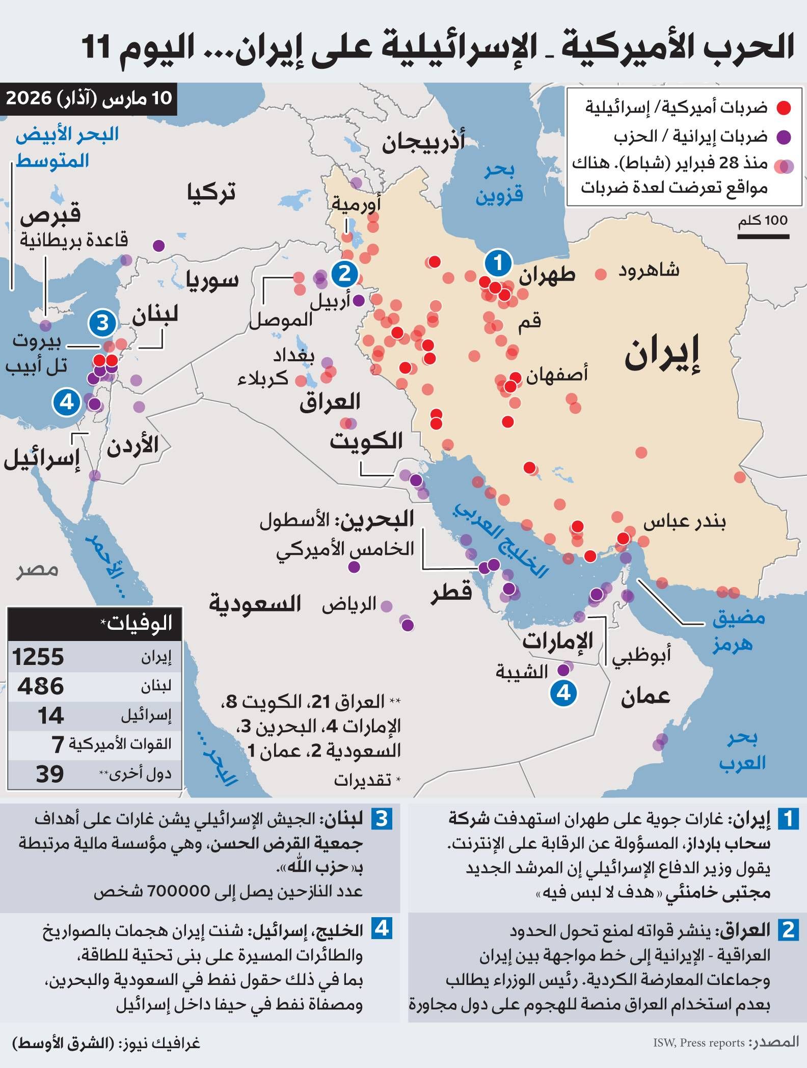 أما على صعيد الخسائر، فقد قالت السلطات إن ما لا يقل عن 1230 شخصاً قُتلوا في إيران، و11 في إسرائيل، إلى جانب سبعة عسكريين أميركيين.