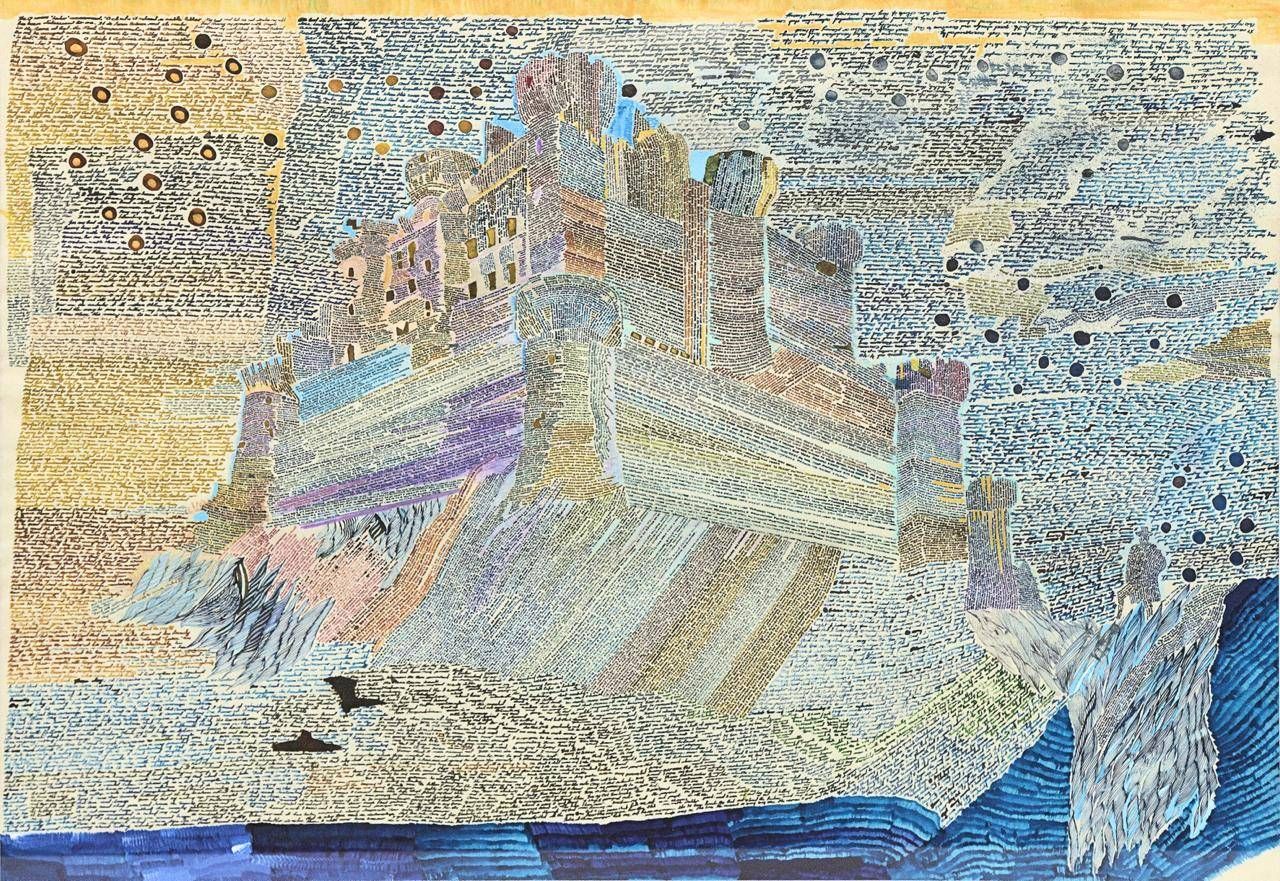 وفي أعمال أخرى، نرى في النصّ بنية معمارية واضحة. ففي إحدى اللوحات، تظهر قلعة ضخمة مبنية بالكامل من الكلمات المكتوبة بخطوط دقيقة، ممّا يمنح المشهد إحساساً بأنّ العمارة تنبثق من اللغة. الجدران والأبراج تتكوَّن من تراكم النصوص، فيتحوَّل الحرف إلى عنصر بنائي يُشكّل صلابة الشكل وامتداده.