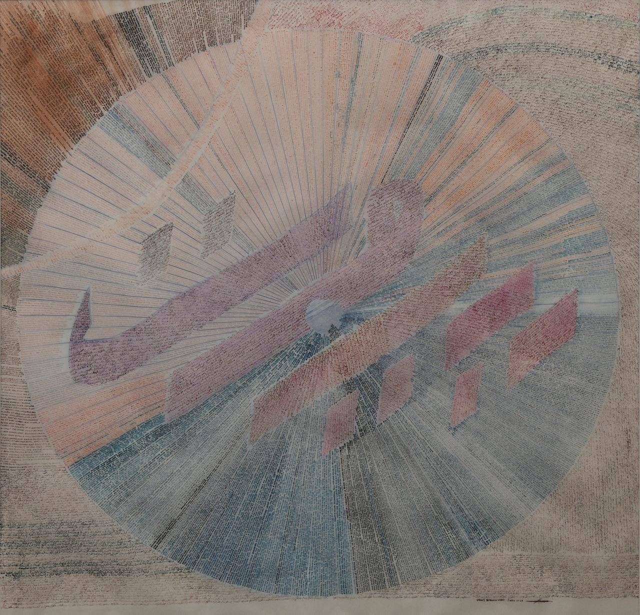 ضمن هذه المجموعة، تحتلّ لوحة «بيروت» موقعاً محورياً لجهتَي الحجم والكثافة البصرية. العمل الذي يمتدّ على مساحة متر في متر يقوم على بنية دائرية واسعة تنطلق من مركز اللوحة وتتشعَّب في خطوط شعاعية دقيقة من الكتابة. هذا التكوين يمنح العمل إحساساً بحركة مستمرّة، كأنّ المدينة تتفتح داخل فضاء من النصوص المُتراكمة.