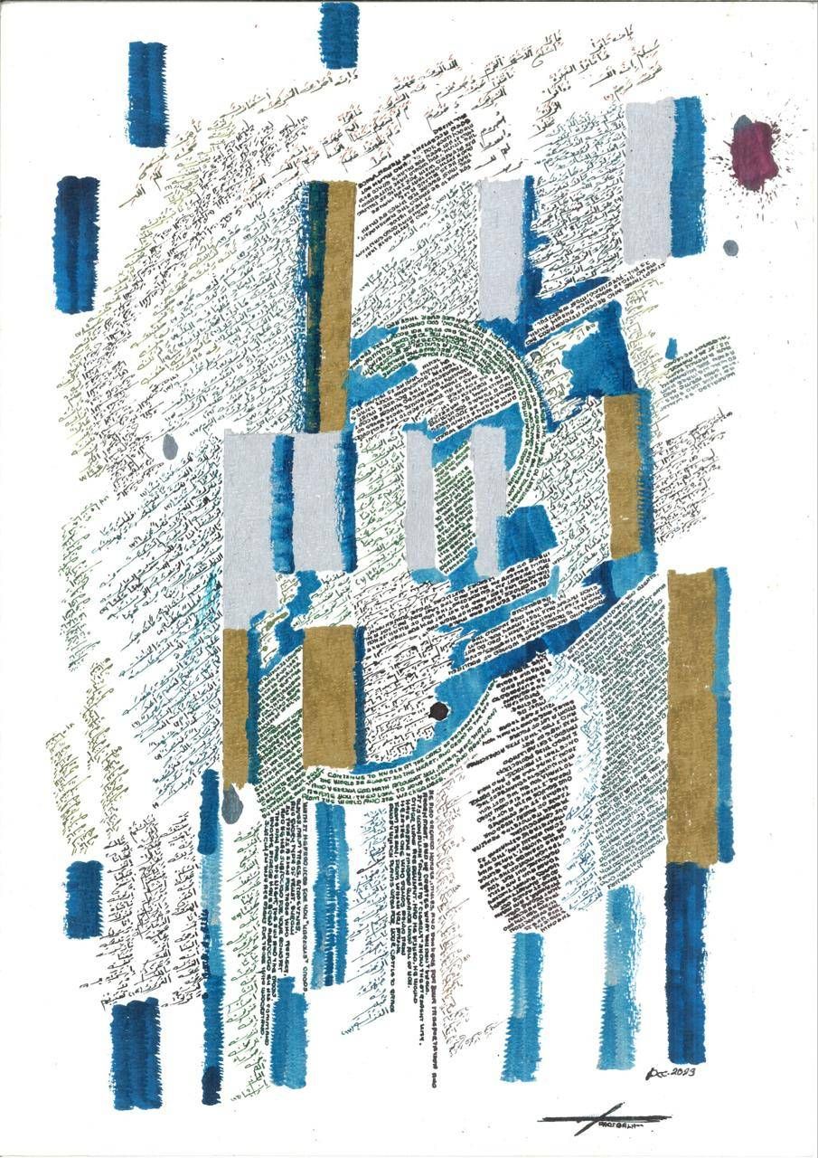 وفي الأعمال الأقرب إلى التجريد، يتّخذ التكوين طابعاً إيقاعياً واضحاً. تتكرَّر الكتابة لتُشكّل طبقات كثيفة تتخلّلها مساحات من الأزرق والذهبي أو خطوط عمودية تقطع السطح. هذه التكوينات تمنح اللوحة إحساساً بإيقاع بصري متدرِّج، حيث تتجاور الحركة اللونية مع انتظام الكتابة في شبكة من الخطوط الدقيقة.