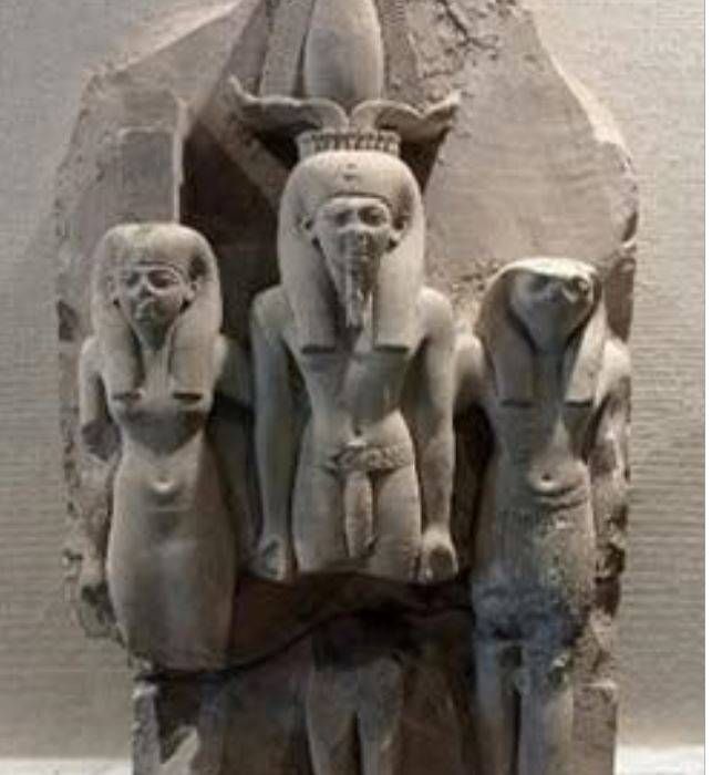 بينما يعرض متحف الإسماعيلية لوحة من الحجر الجيري تعود للدولة القديمة تمثل الثالوث المقدس في نقش بارز، حيث تظهر إيزيس على اليمين وحورس على اليسار، بينما يتوسطهما الملك ممثلاً للإله أوزيريس، في مشهد يعكس دور إيزيس كحامية للملك ولابنها حورس.