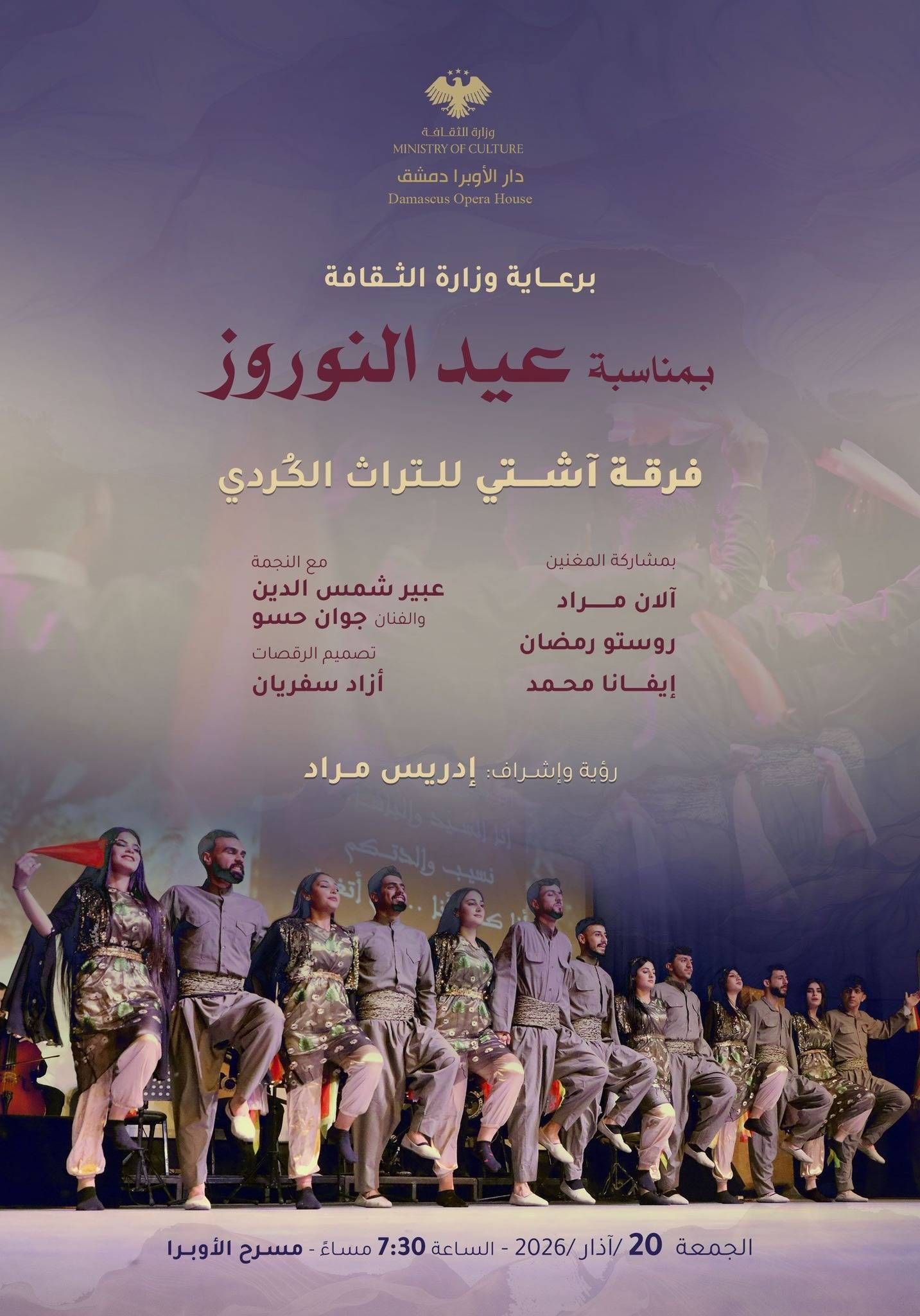 وتصدر ملصق إعلاني ضخم لحفل فني بمناسبة عيد النوروز في ساحة الأمويين، إحدى أكبر وأهم ساحات العاصمة السورية، كمفاجأة لاقت ترحيباً من السوريين، فقد دعت وزارة الثقافة السورية إلى حضور حفل فني لفرقة «آشتي» للتراث الكردي الخميس المقبل، على مسرح دار الأوبرا، بينما يجري التحضير لاحتفال كبير على أرض ملعب الفيحاء في حي مشروع دمر شمال غرب دمشق، بالإضافة للاحتفالات في بعض الأحياء، مثل ركن الدين ووادي المشاريع، حيث يتركز الأكراد الدمشقيون.