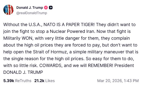 وكتب ترمب: «لولا الولايات المتحدة، لكان حلف الناتو مجرد نمر من ورق! لقد أحجموا عن الانخراط في المعركة الرامية إلى وقف تحول إيران إلى قوة نووية. والآن، وقد حُسمت تلك المعركة عسكرياً - مع ما انطوى عليه ذلك من مخاطر ضئيلة للغاية بالنسبة لهم - تراهم يتذمرون من ارتفاع أسعار النفط التي يُجبرون على دفعها، ومع ذلك يرفضون تقديم العون لفتح مضيق هرمز؛ وهي مناورة عسكرية بسيطة تُعد السبب الأوحد وراء ارتفاع أسعار النفط هذا. إنه لأمر يسير للغاية عليهم إنجازه، وينطوي على مخاطر لا تكاد تُذكر. إنهم جبناء، ولن ننسى ذلك أبداً!».