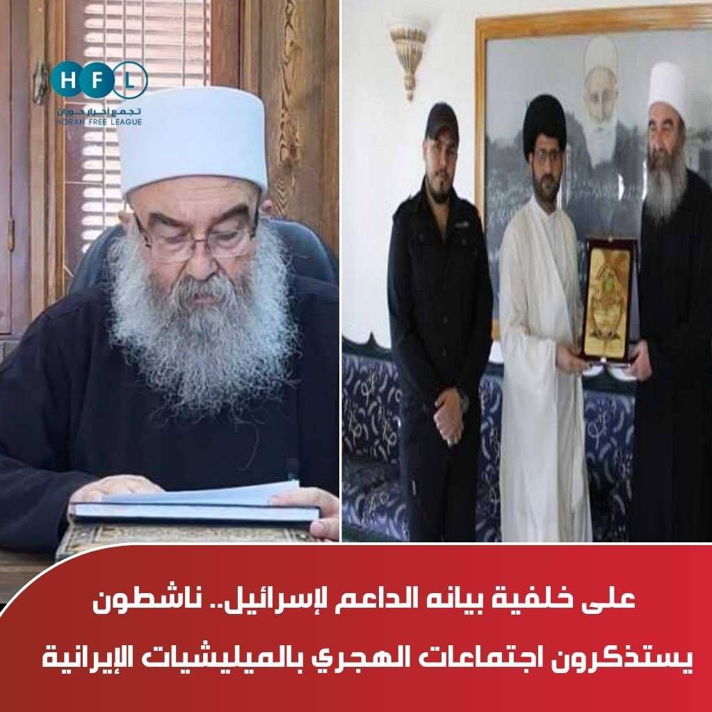 وأثار البيان، جدلاً واسعاً بين السوريين، وذلك على خلفية موقف الهجري المؤيد للضربات العسكرية الأميركية والإسرائيلية التي تستهدف إيران، وأعاد ناشطون سوريون بينهم موقع «تجمع أحرار حوران» تداول صور تعود إلى عام 2017، تظهر الهجري إلى جانب قيادات من ميليشيات إيرانية كانت تنشط في الجنوب السوري آنذاك، واتهم هؤلاء الهجري بتبديل مواقفه تبعاً لمصادر الدعم والمصالح.