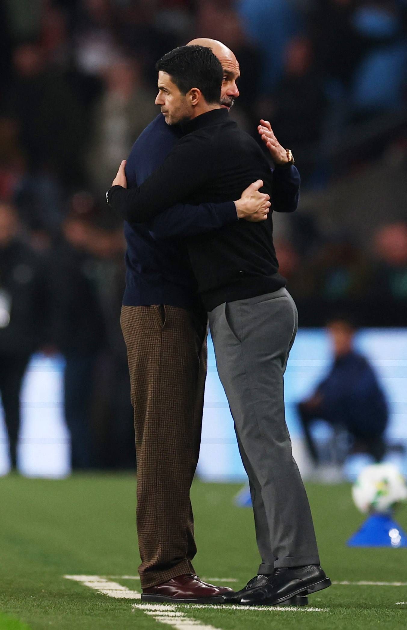 غوارديولا يواسي أرتيتا بعد فوز سيتي على آرسنال في نهائي كأس الرابطة (رويترز)Cutout