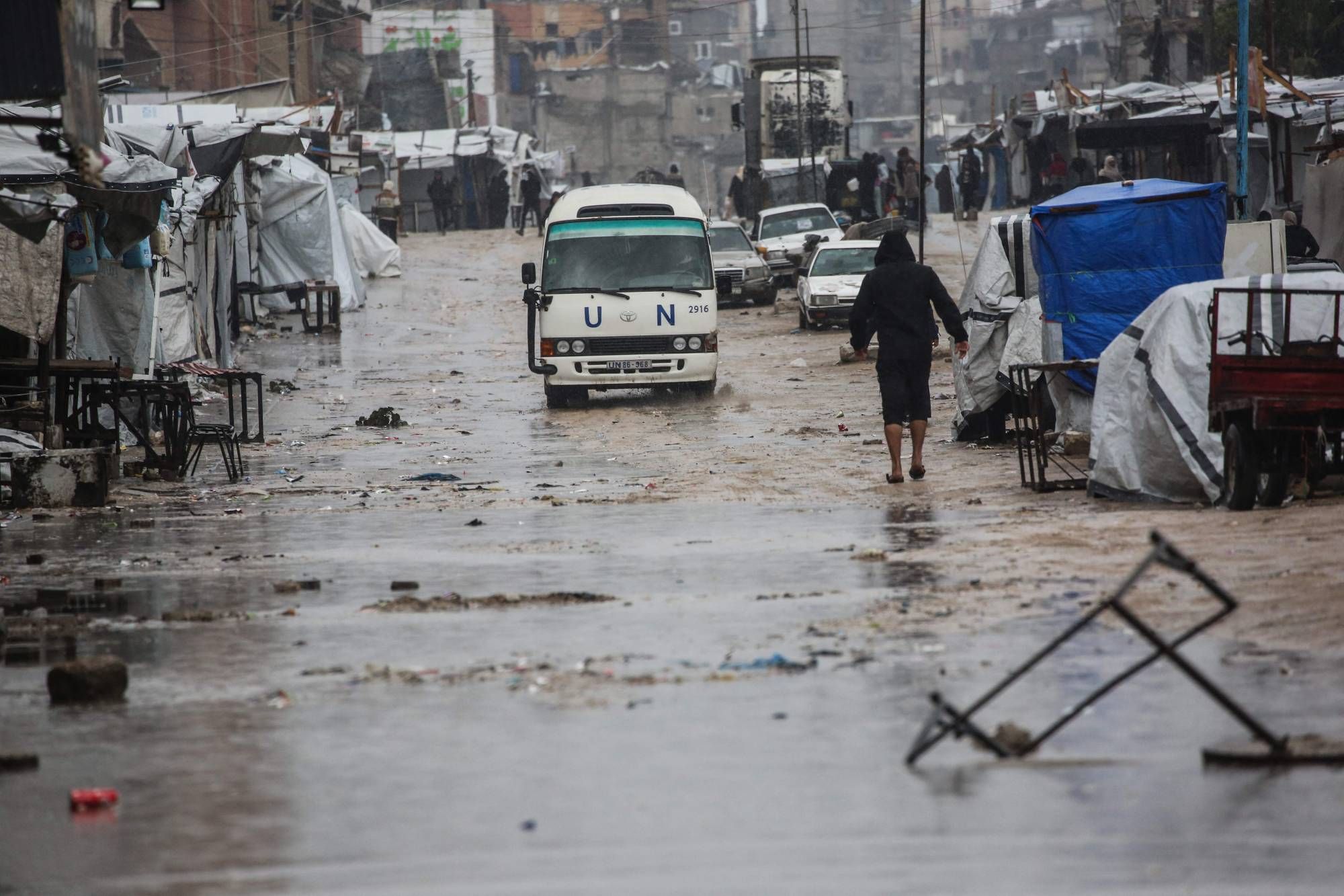 حافلة تابعة للأمم المتحدة تسير على طريق موحل بجوار خيام تؤوي نازحين فلسطينيين عقب هطول أمطار غزيرة في خان يونس... جنوب قطاع غزة 26 مارس 2026 (أ.ف.ب)
