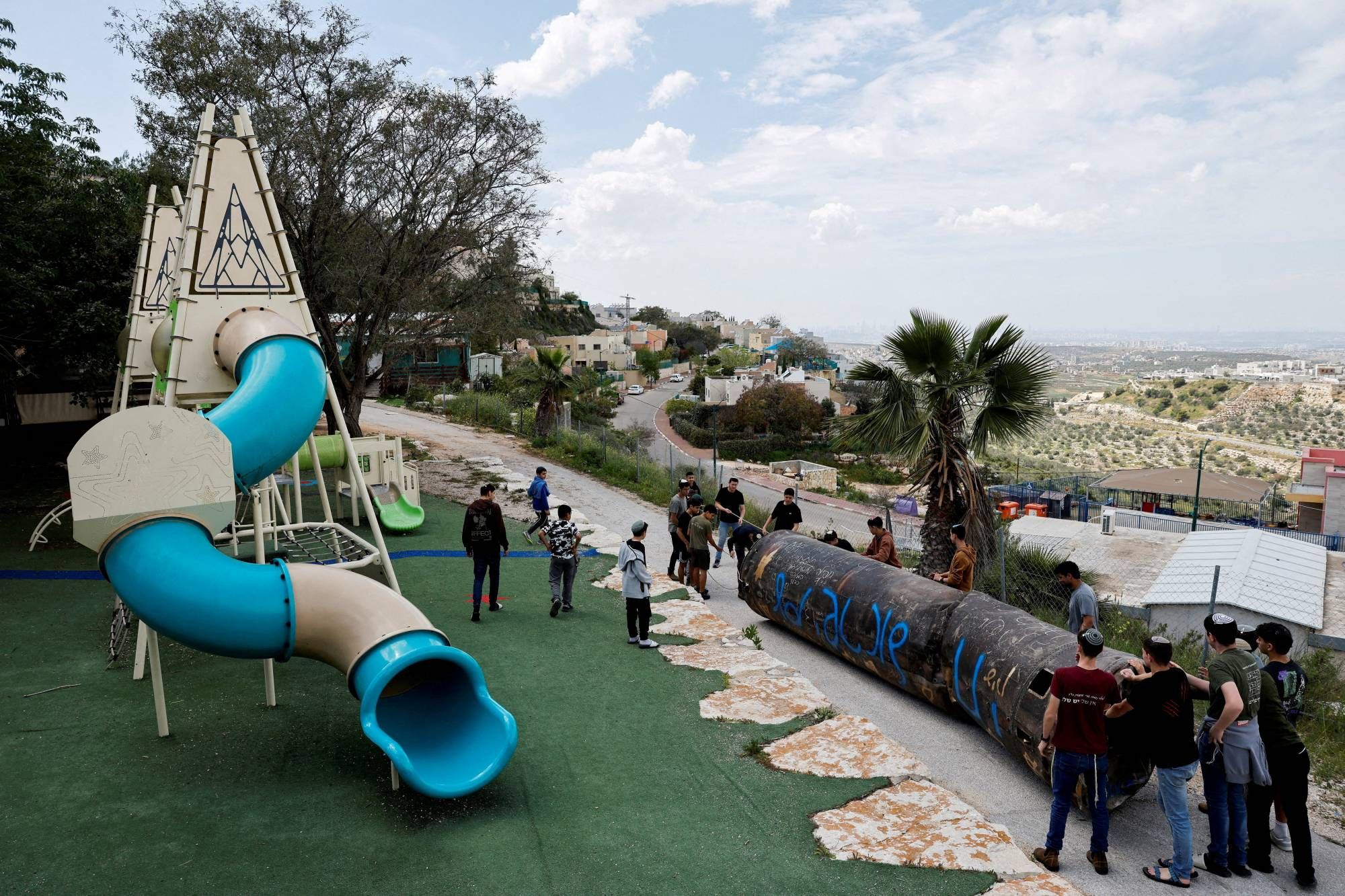 وبالقرب من مدينة نابلس الفلسطينية، وقفت فتاة صغيرة مع شظية صاروخ سقطت في بستان من شجر الزيتون. وفي مدرسة إسرائيلية في مستوطنة بالضفة الغربية، تسلق الأطفال غلاف صاروخ معدني ضخم سقط في الملعب.