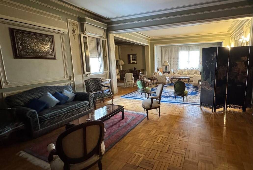 الصالة الفسيحة، التي تتميز بأثاثها الكلاسيكي وإضاءاتها الصفراء، وأرضيتها الباركيه وسجادها الملوَّن، مقسّمة إلى 3 أقسام؛ يقود أحدها إلى ممر الغرف الداخلية للشقة، في حين يفضي القسم الآخر إلى باب الشرفة المُطلَّة على حديقة الأسماك.