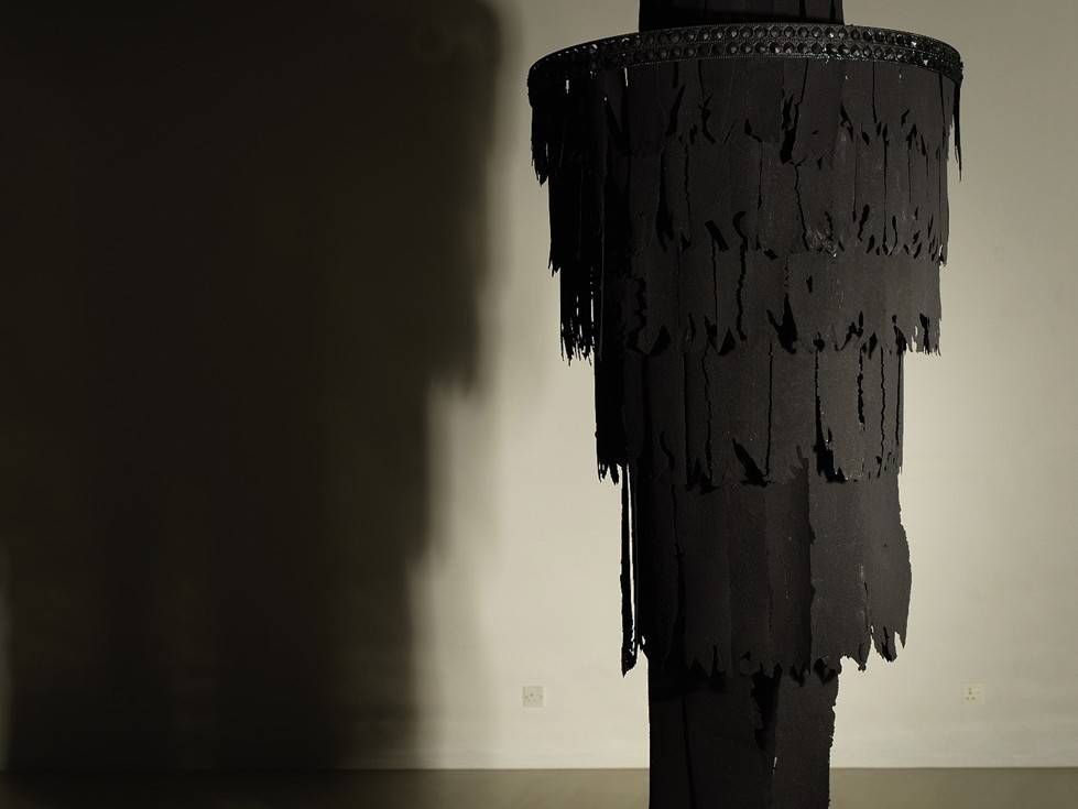 أما القسم الأخير للمعرض، فهو بعنوان «قطع من الليل»، ويضمّ ثريات مُعلّقة خرجت من سياقها الوظيفي بكونها أدوات للإنارة، وزُيّنت هياكلها بشرائح رقيقة متدرجة الطول من الفحم المعالج.