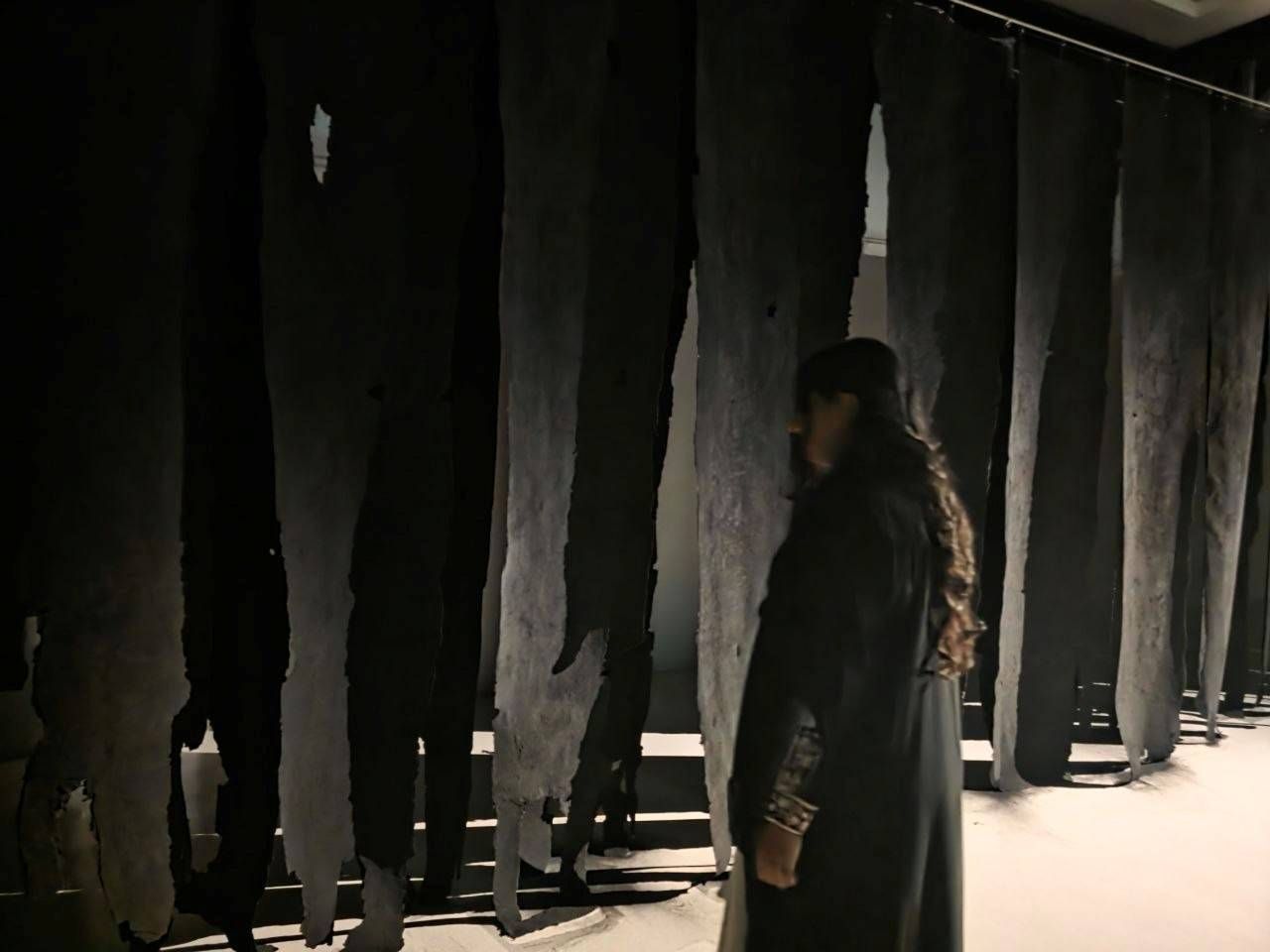 في القسم الثاني، ضمن مساحة شبه مُعتمة، يبرز العمل التركيبي الضخم «سدول» على هيئة ستائر ممزقة، تتكوَّن من طبقات من شرائح الفحم المُعالج التي تنسدل بأطوال مختلفة، يلامس بعضها الأرض ويترك أثره عليها. في هذا العمل تتجلَّى تناقضات الفحم؛ فعند النظر إلى طبقاته يغمر المُشاهد شعور بالعمق، يتبدَّد بمجرَّد ملاحظة الضوء المتسلِّل عبر الشقوق. وعند الاقتراب من العمل، تبدو الشرائح كأنها على وشك أن تنكسر وتتلاشى، وإنما الابتعاد قليلاً يُحوّله إلى جسد أسود يهيمن على المكان. ومع إطالة تأمُّل العمل، تتولد أيضاً مشاعر متناقضة بين القلق والسكون.
