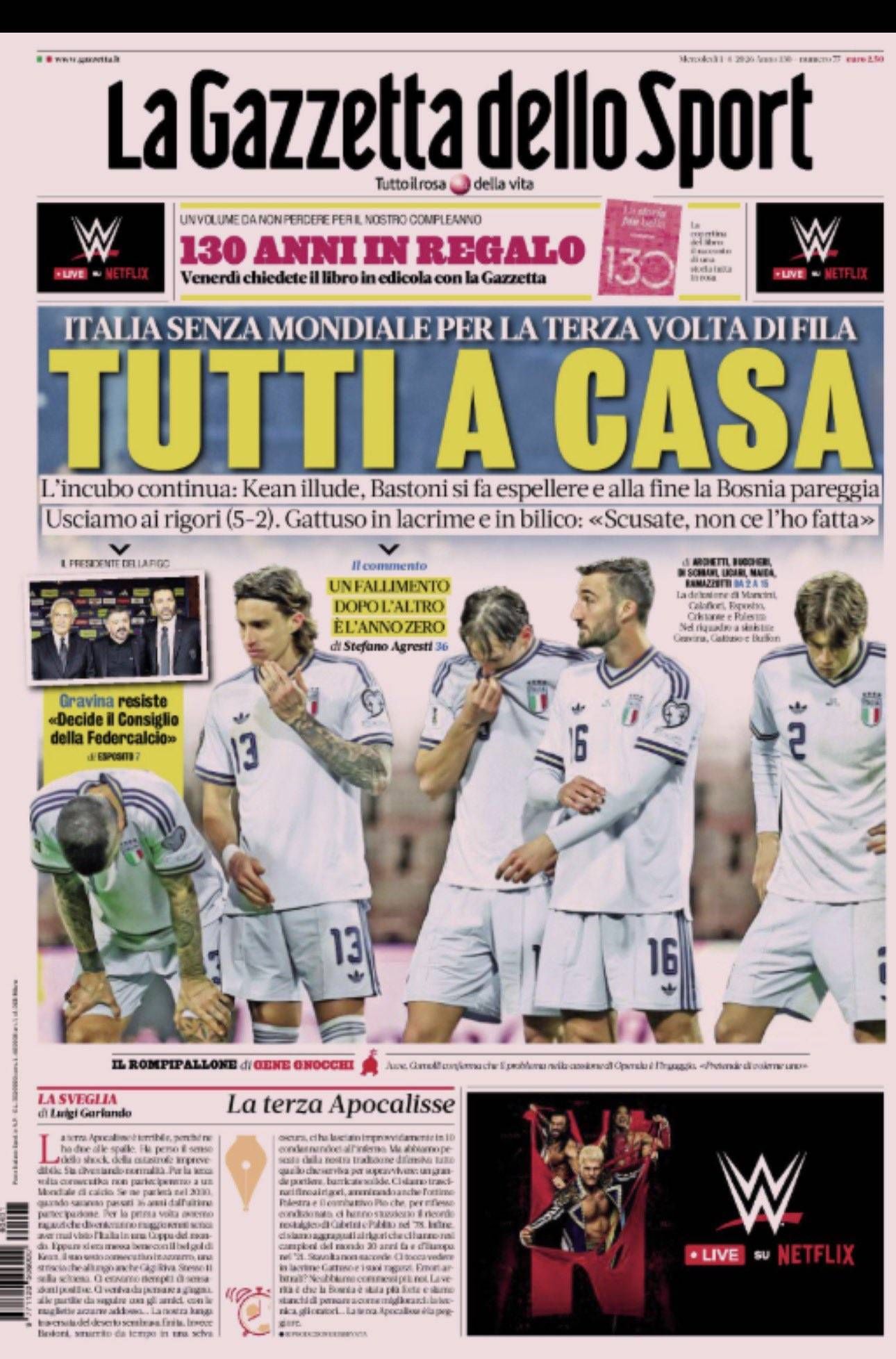 «لاغازيتا ديلو سبورت» ركزت على البعد التاريخي للأزمة، معتبرة أن الغياب للمرة الثالثة توالياً يؤكد تحول الإخفاق إلى ظاهرة مستمرة، لا مجرد نتيجة عابرة، مع إبراز المشهد الإنساني للمدرب جينارو غاتوزو الذي ظهر متأثراً وقدم اعتذاره.