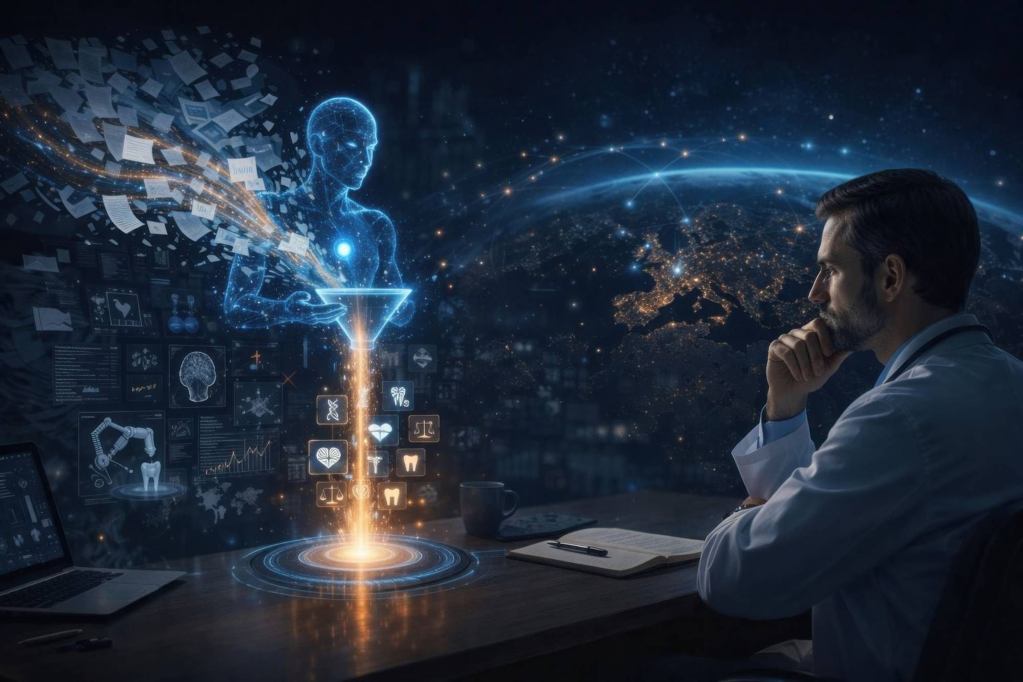 وبهذا المعنى، يمكن عدّه «القارئ الأول» للأدبيات العلمية؛ إذ يمرّ على كمّ هائل من الأبحاث ويعيد تقديمها في صورة مختصرة ومركزة. ولا يقتصر هذا التحول على تسريع الوصول إلى المعلومات، بل يغيّر طريقة التعامل معها. فبدلاً من أن يبدأ الطبيب بالبحث، أصبح يبدأ بما تم اختياره له مسبقاً.