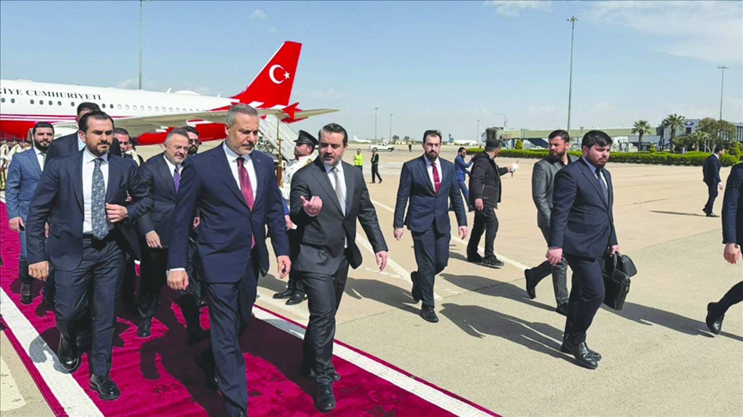 الشيباني يستقبل نظيره التركي هاكان فيدان لدى وصوله إلى مطار دمشق الدولي في زيارة رسمية (الأناضول)