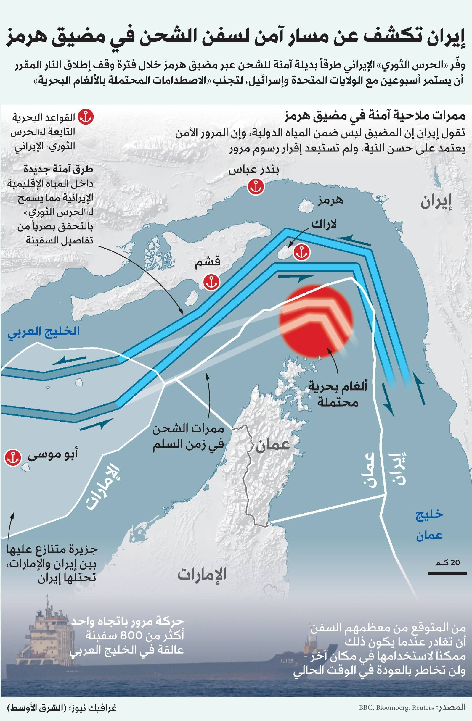 أصدر «الحرس الثوري» الإيراني تحذيراً جديداً بشأن عبور السفن في مضيق هرمز، مشيراً إلى وجود ألغام بحرية في الممرات التقليدية، وطالب السفن بسلوك مسار محدد عبر المياه الإيرانية المحيطة بجزيرة لارك.