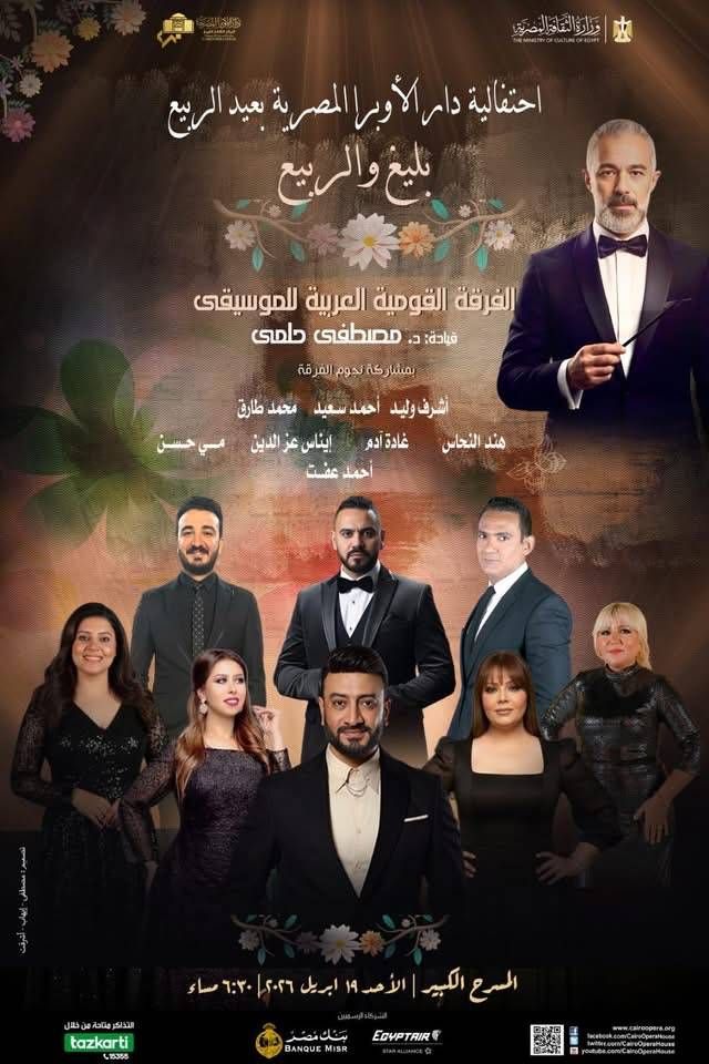 وتحت عنوان «بليغ والربيع»، تقيم «دار الأوبرا» المصرية حفلها الغنائي الاستثنائي لتقديم ألحان الموسيقار المصري الراحل «بليغ حمدي»، بمصاحبة الفرقة القومية العربية للموسيقى بقيادة المايسترو الدكتور مصطفى حلمي، وبمشاركة نخبة من أصوات الأوبرا، وهم أشرف وليد، وأحمد سعيد، ومحمد طارق، وأحمد عفت، وغادة آدم، وإيناس عز الدين، وهند النحاس، ومي حسن.