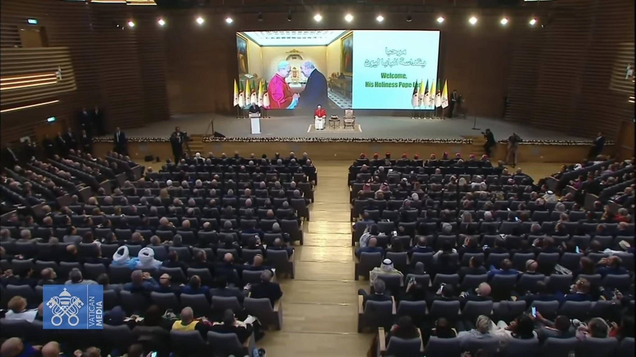 واستطرد قائلاً: «في وقتٍ تعصف فيه الحروب بأمن واستقرار مناطق عديدة، وفي مقدمتها الشرق الأوسط، نجد في قداستكم صوتاً شجاعاً ومرافعاً وفياً عن السلام. وإننا لنستمد العزاء من مواقفكم الإنسانية النبيلة تجاه مأساة غزة وما تخلفه من آلام».