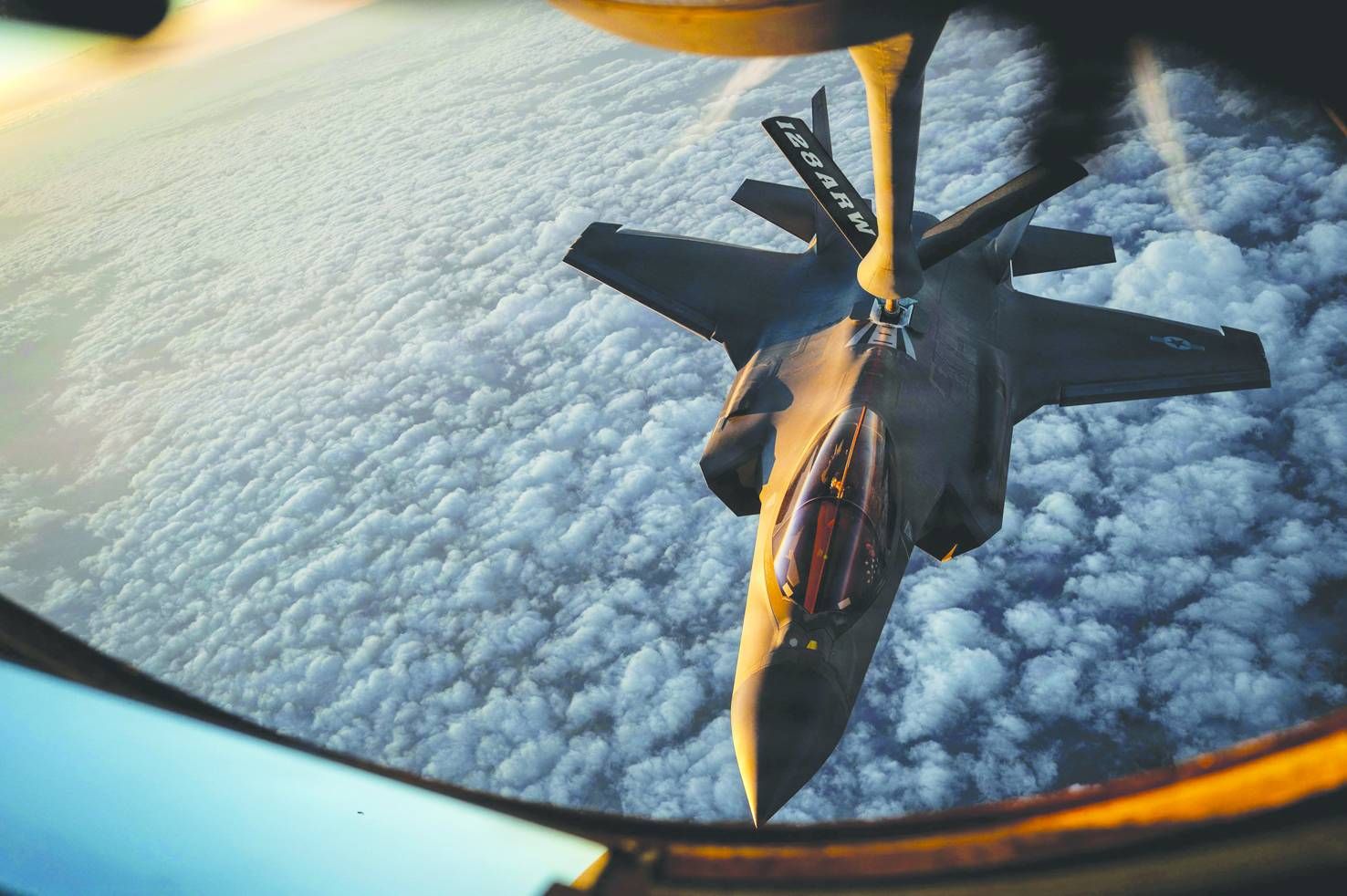صورة وزعتها «سنتكوم» يوم 13 أبريل 2026 لمقاتلة أميركية من طراز «إف 35 إيه» وهي تتزود بالوقود فوق منطقة الخليج