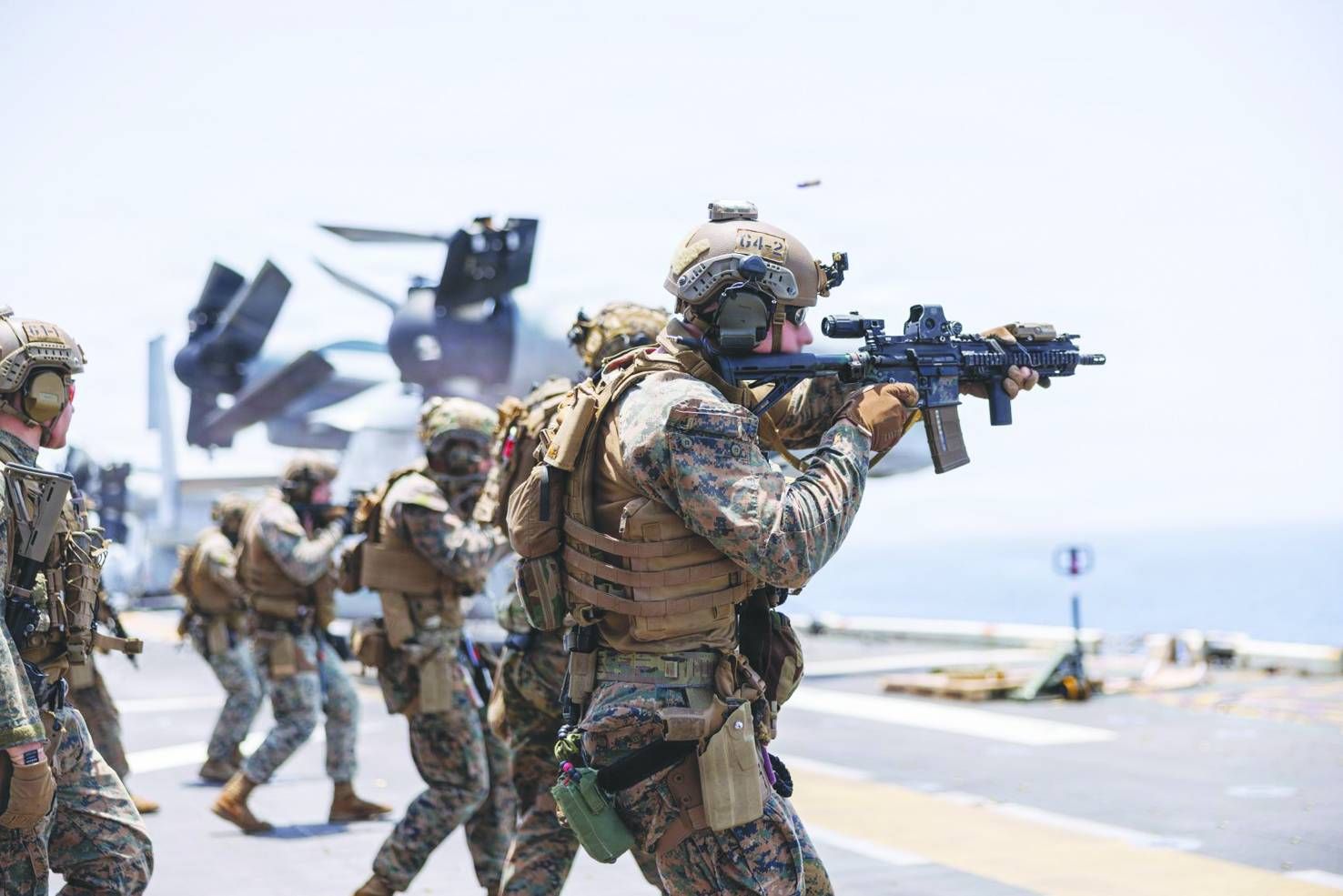 جنود من البحرية الأميركية خلال تدريبات إطلاق نار على سطح السفينة «يو إس إس تريبولي» يوم 2 أبريل 2026 (سنتكوم)