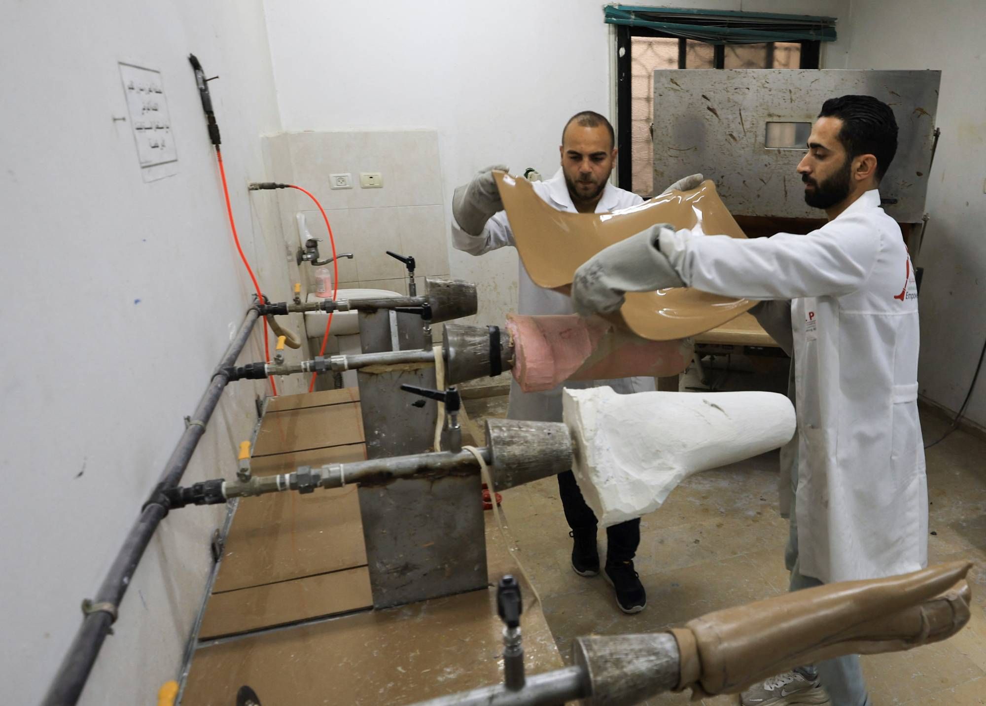 لا يمكن استيراد الأطراف الاصطناعية كاملة إلى غزة لأنَّها تُصنَع لكل مريض على حدة، ويُستخدَم الجبس لأخذ قالب دقيق لما تبقَّى من الطرف لتشكيل تجويف مخصَّص له.