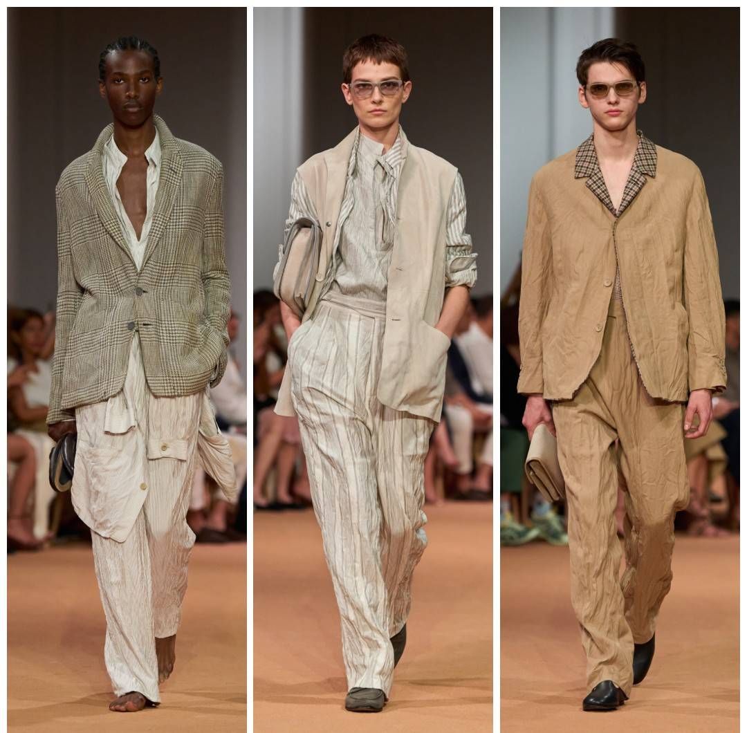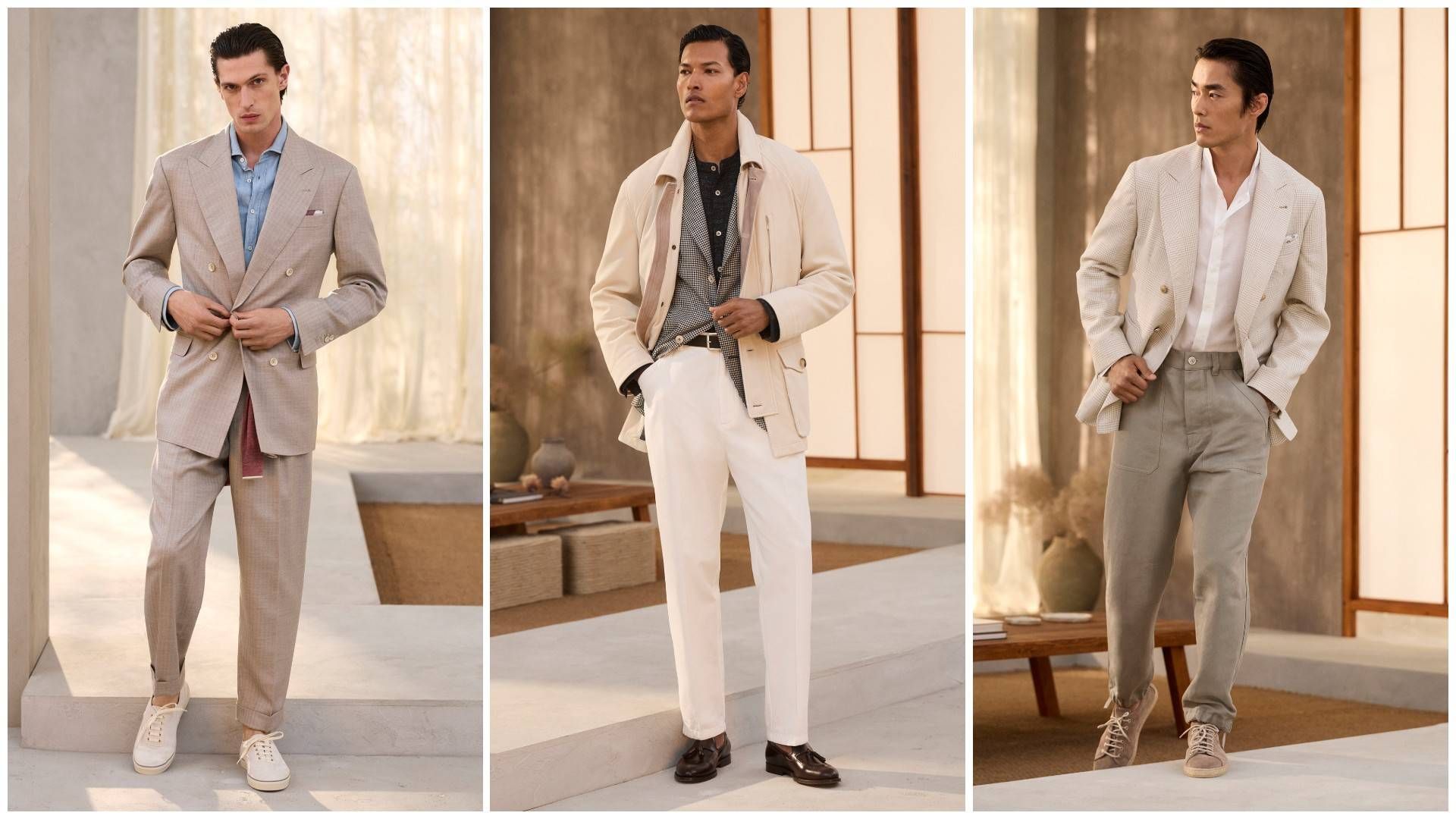 «برونيلو كوتشينيلي» و«زينيا» و«سان لوران» و«هوكرتي» هي الأخرى تفننت هذا الموسم في توظيف هذه الدرجات، مستهدفةً رجلاً أنيقاً يسعى للانطلاق والتحرُّر من أي قيود قد تحدّ من خياراته؛ فهدوء الألوان لم يقتصر على اللوحة البصرية فحسب، بل امتدّ إلى التصاميم أيضاً، حيث تم تنعيم الأكتاف والتخفيف من سماكة ووزن السترات، بالاستغناء أحياناً عن التبطين. وهكذا تكتسب في الصيف خفة تتنفس عبر خيوط الكتان والقطن، وفي الشتاء عمقاً ودفئاً، حين تُنسج بالصوف والكشمير.