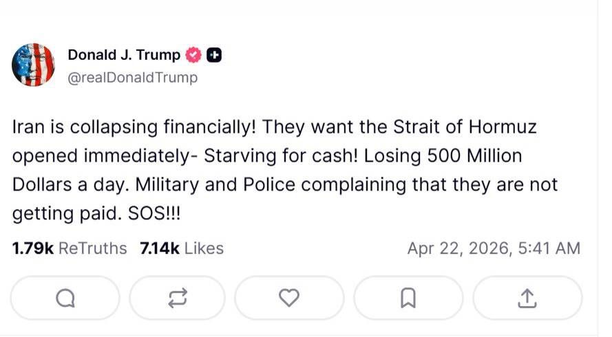 وكتب على منصته «تروث سوشيال» أن «إيران تنهار مالياً! إنها تريد فتح مضيق هرمز فوراً»، مضيفاً أن إيران «تعاني شحاً في السيولة». وأضاف: «يخسرون 500 مليون دولار يومياً. الجيش والشرطة يشكون من عدم تقاضيهم رواتبهم. نداء استغاثة!»، وفقاً لما ذكرته «وكالة الصحافة الفرنسية».