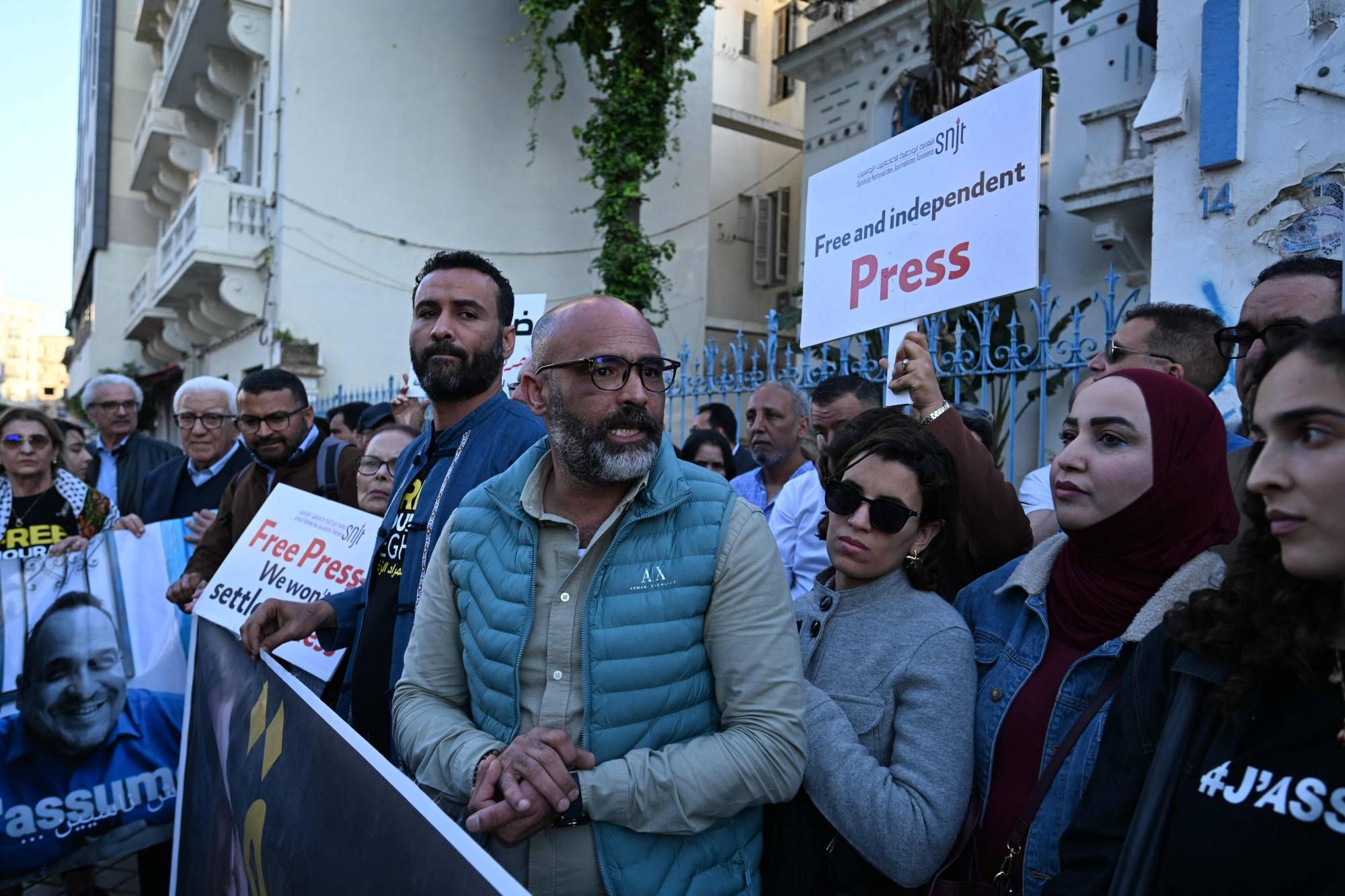 وردَّد المشاركون في الوقفة هتافات، من بينها: «الحرية للصحافة التونسية»، و«أبرياء موجودون في السجون»، بينما رفعوا لافتات كُتب عليها: «لا للتضييق على الصحافيين»، و«ارفعوا أيديكم عن العمل الصحافي»، وبالإنجليزية: «صحافة حرة مستقلة».