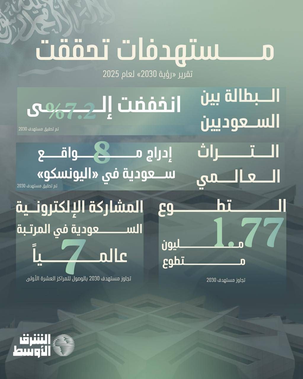 ومن أصل 390 مؤشراً مُفعَّلاً، حقّق 309 منها مستهدفاتها المرحلية أو تجاوزتها، فيما اقترب 52 مؤشراً من تحقيق المستهدف بنسبة تتراوح بين 85 و99 في المائة.