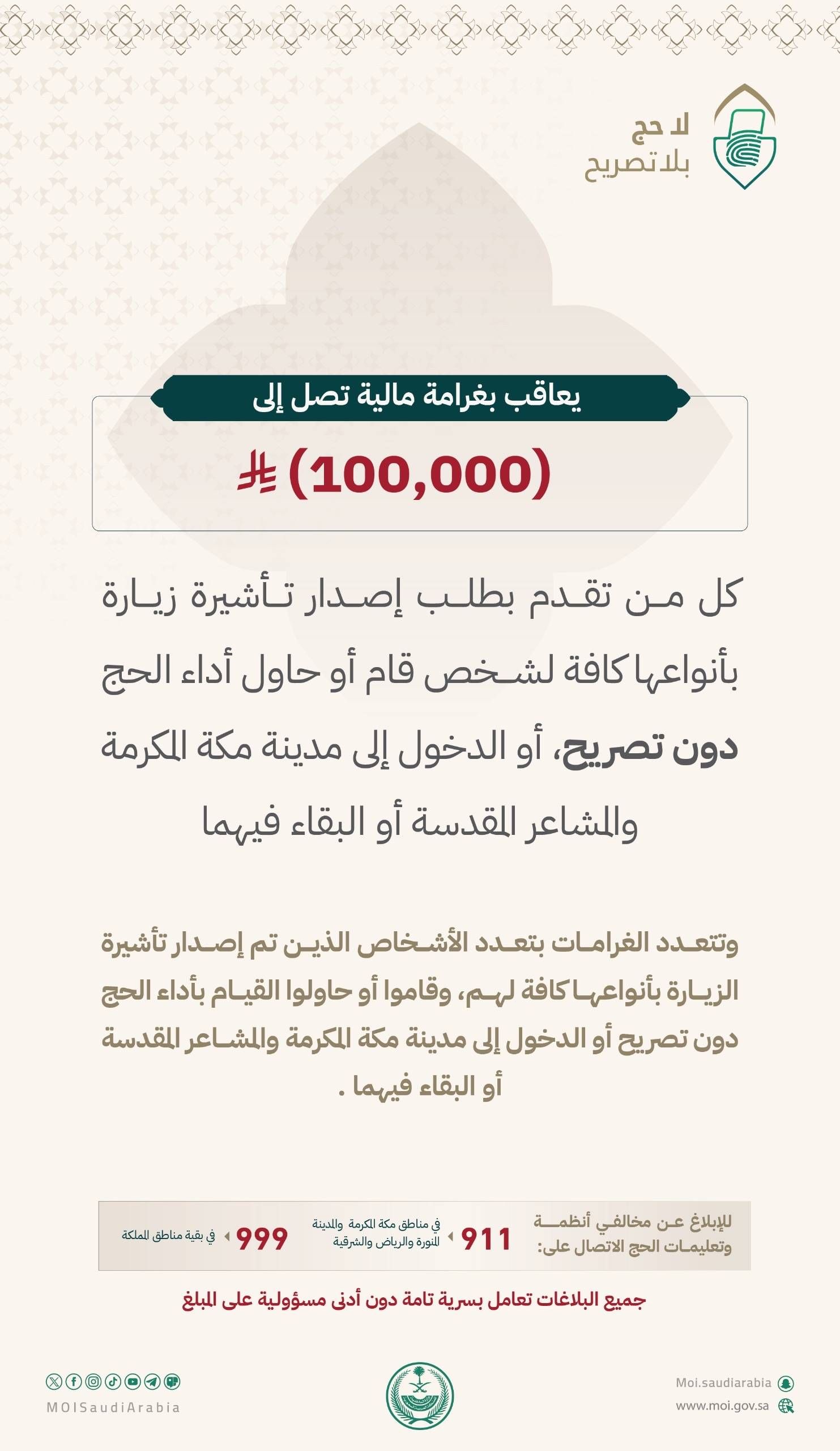جددت وزارة الداخلية السعودية التأكيد على تطبيق غرامة مالية تصل إلى 100 ألف ريال (26.6 الف دولار) بحق كل من تقدم بطلب إصدار تأشيرة زيارة بأنواعها كافة لشخص قام أو حاول أداء الحج دون تصريح، أو الدخول إلى مدينة مكة المكرمة والمشاعر المقدسة أو البقاء فيهما.