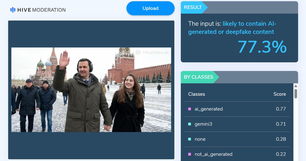 كما أكدت نتائج فحص الصورة من خلال أدوات تقنية، منها Hive Moderation، نفس النتيجة.