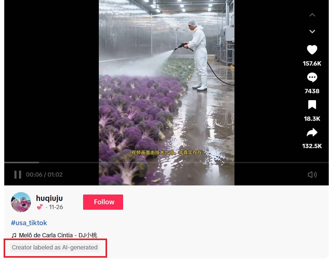 وسم تيك توك الفيديو بأنه "مُنشأ بواسطة الذكاء الاصطناعي"، وهي سياسة اعتمدها الموقع لتصنيف المحتوى المُنشأ أو المُعدل بشكل كبير بواسطة الذكاء الاصطناعي. يتم التصنيف تلقائيًا منذ مايو/أيار 2024.