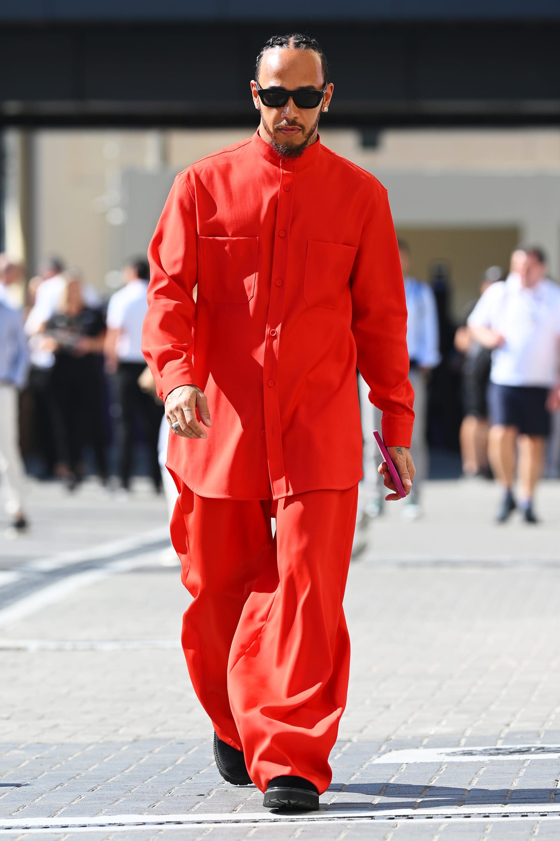 ليست هذه المرة الأولى التي يختار فيها السائق البريطاني إطلالة حمراء بالكامل، فقد ارتدى العام الماضي زيًا مستوحى من ألوان "فيراري" من تصميم دار "ديور" أيضًا، تألّف من قميص أحمر، وسروال واسع متناسق، وحذاء أسود، مع نظارات شمسية ذات إطار مربع من دار "غوتشي" الإيطالية.