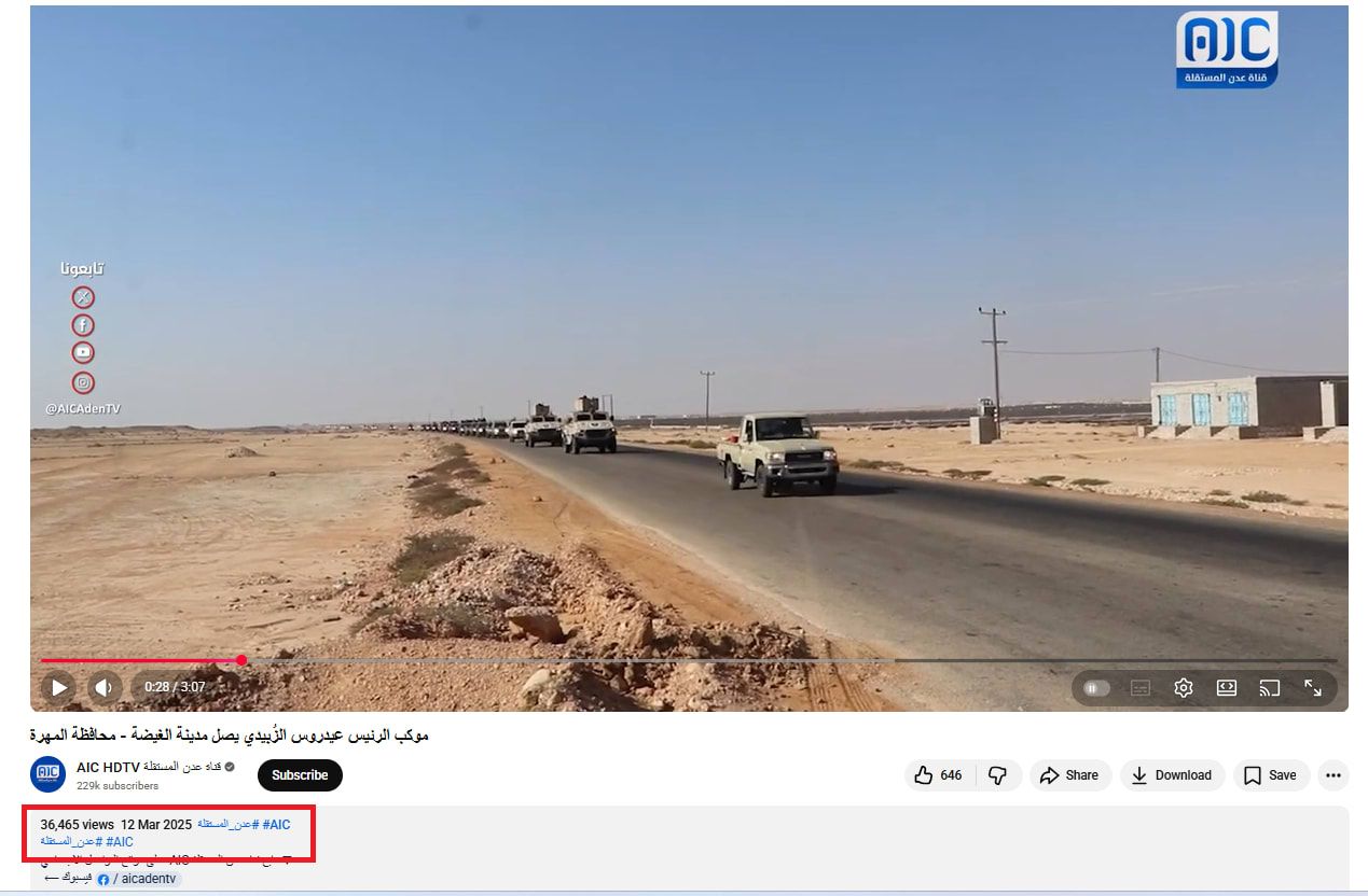 كان عنوان القناة للفيديو: "موكب الرئيس عيدروس الزُبيدي يصل مدينة الغيضة - محافظة المهرة".