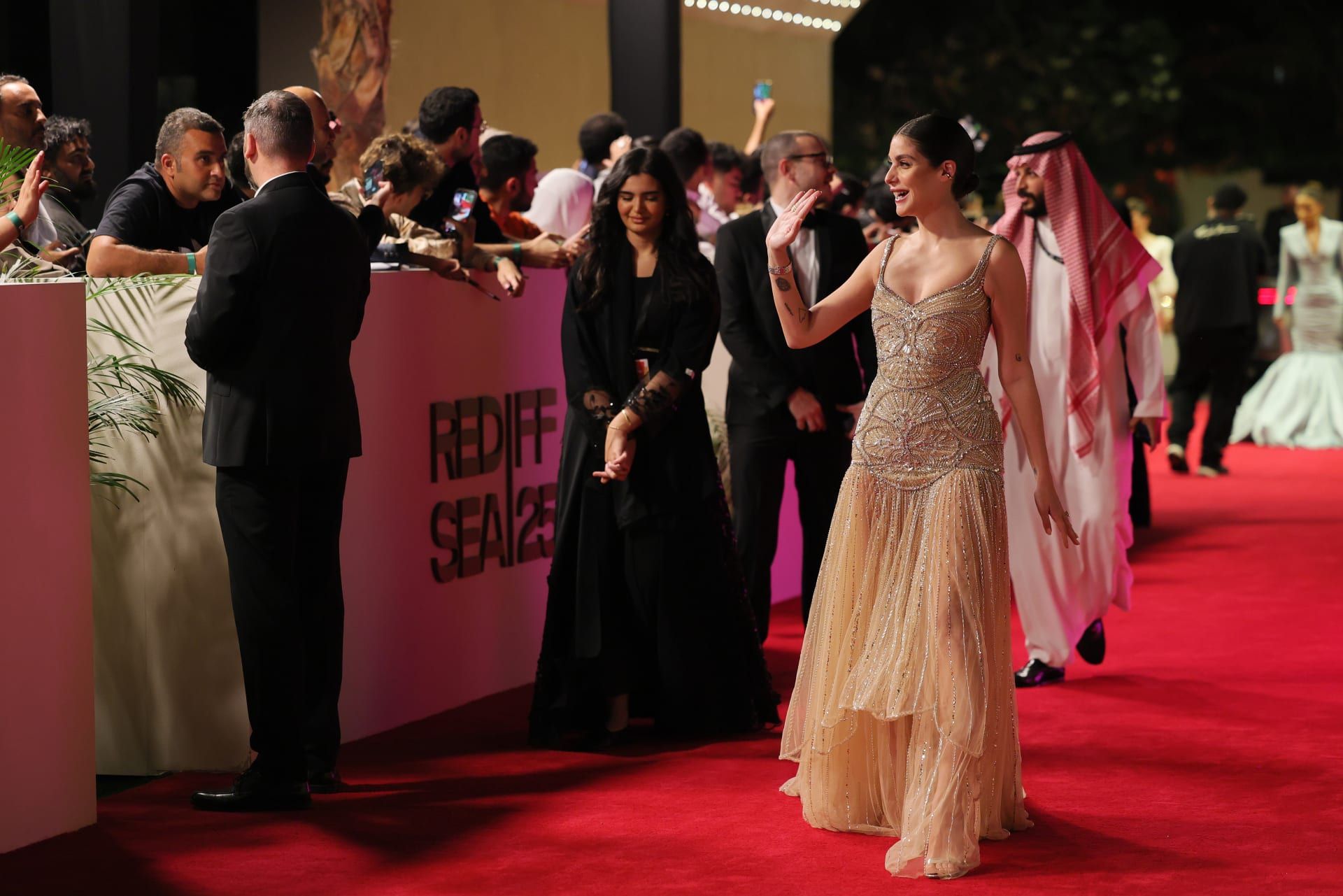 شهدت السجادة الحمراء حضورًا لافتًا للممثلات السعوديّات؛ إذ اختارت عهد كامل فستانًا أحمر بقصّة القميص عند الجزء العلوي وطيات ناعمة حول العنق مع حزام رفيع وتنورة طويلة.