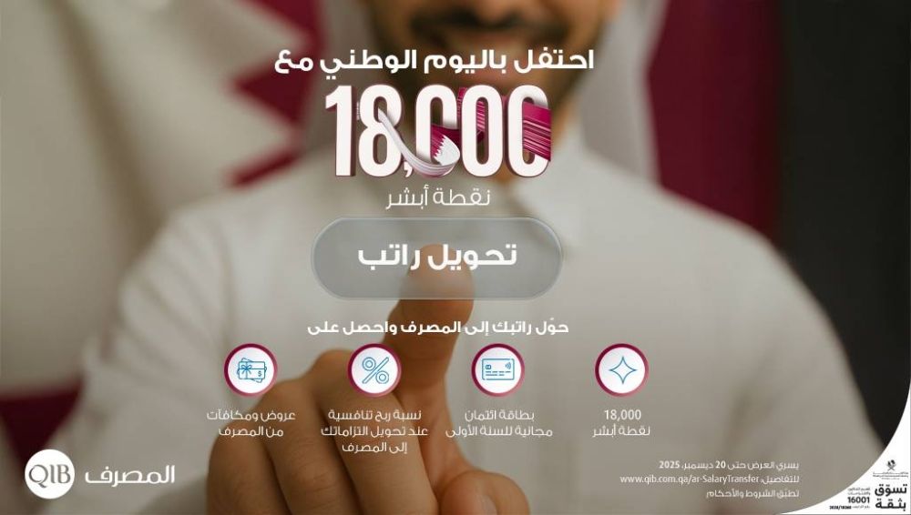 السبت 13 ديسمبر 2025 05:28 مساءً أطلق مصرف قطر الإسلامي (المصرف)، رائد الصيرفة الرقمية في قطر، حملة خاصة لتحويل الراتب بمناسبة اليوم الوطني لدولة قطر 2025، تتيح للعملاء الحصول على نقاط مكافآت أبشر وبطاقة ائتمان مجانية للسنة الأولى عند تحويل رواتبهم إلى المصرف خلال فترة الحملة، والتي تسري حتى 20 ديسمبر 2025.
