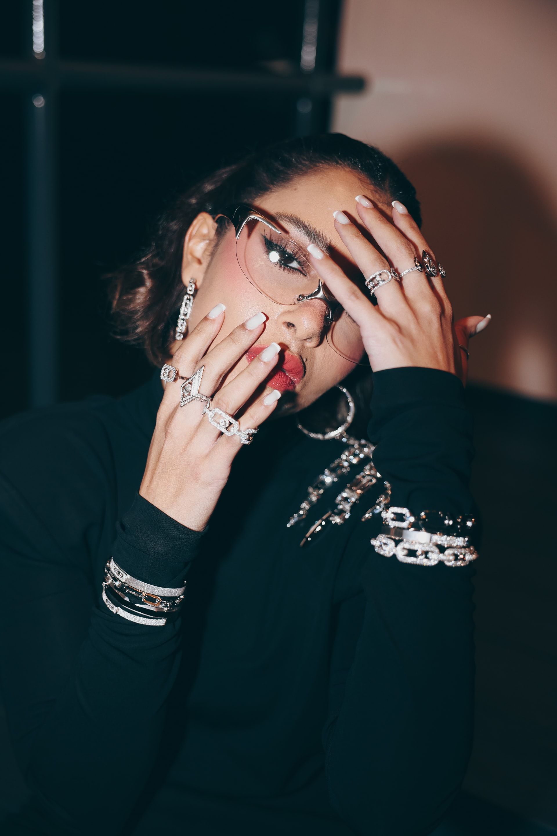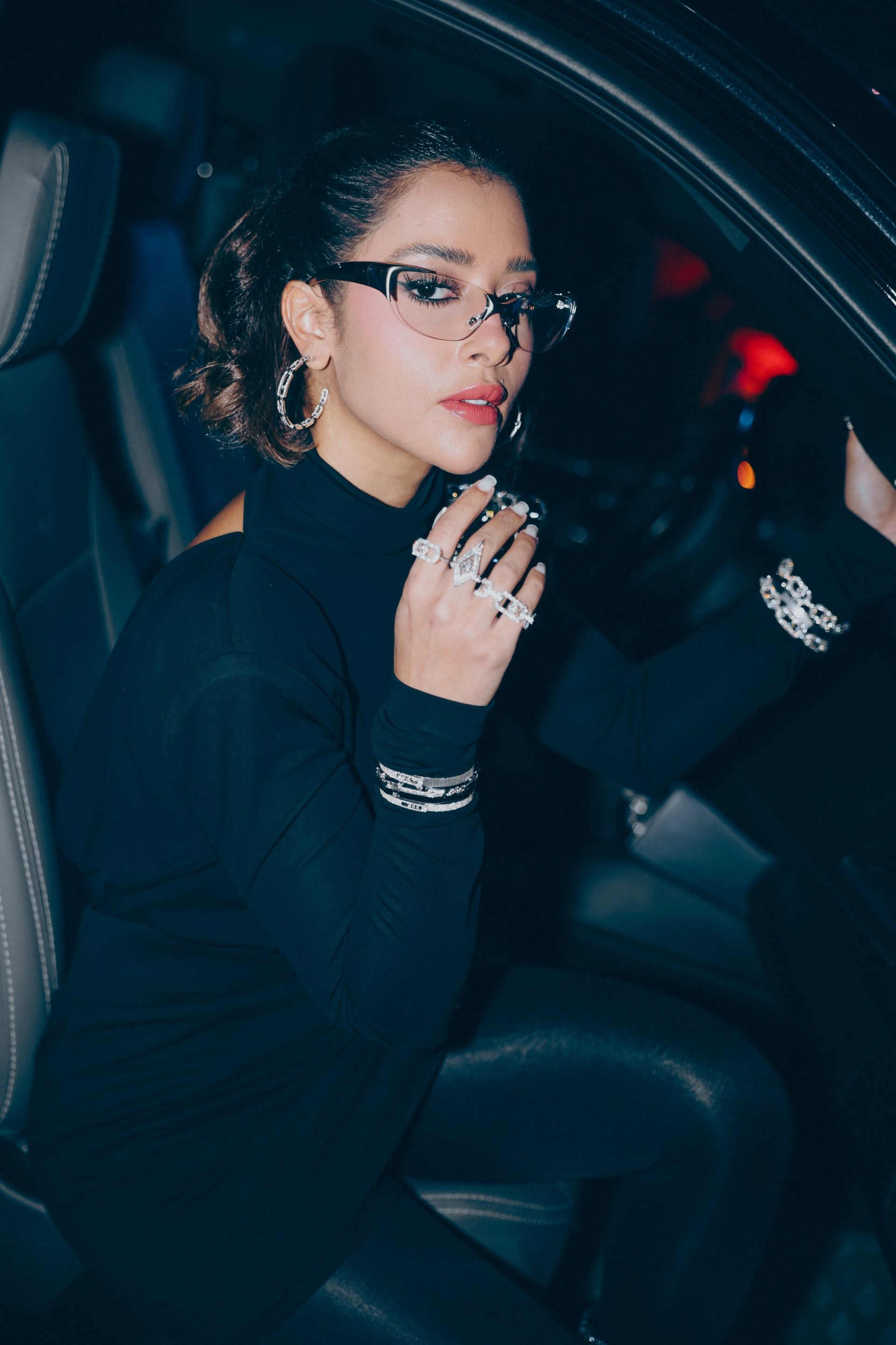 أما الحذاء، فكان عبارة عن "بوتس" مغطى كاملًا بالكريستال، ليشكّل عنصراً أساسياً يُكمّل هذا النوع من الإطلالات الجريئة. كما لعبت الإكسسوارات دوراً محورياً، من خلال المزج الذكي بين النظارات الطبية والمجوهرات، حيث وضع خاتم في كل إصبع، إلى جانب تنسيق مجموعة من الأساور معاً بأسلوب متعمّد ومدروس فوق الأكمام.