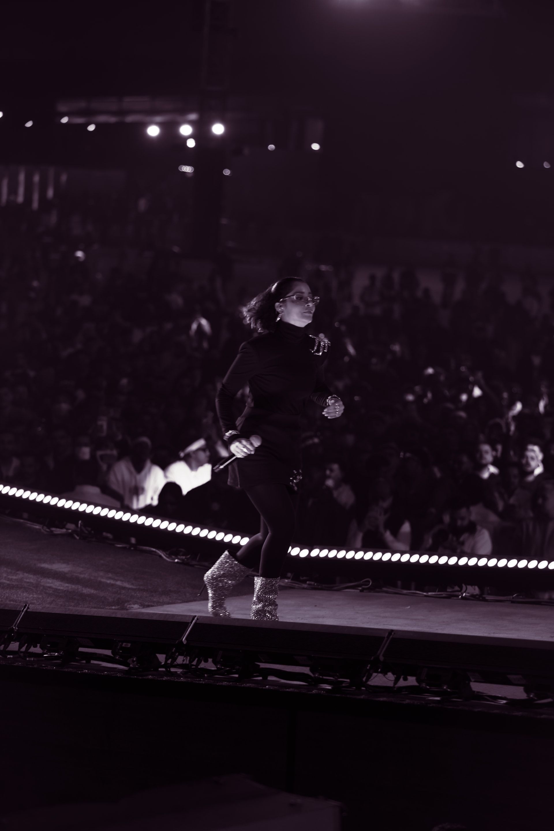وأضاف أن مشاركة فتحي للمسرح مع موسيقيين عالميين من بينهم كاردي بي، فرضت اعتماد إطلالة لا تشبه سواها، بل تنسجم مع هذا السياق العالمي المعاصر. وهكذا وقع الاختيار على تصميم باللون الأسود بأكمام طويلة، وتنورة قصيرة، وجوارب سوداء سميكة.