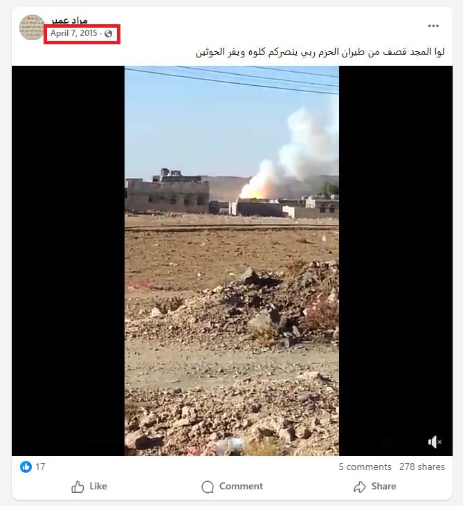 حصد الفيديو عشرات الآلاف من المشاهدات والتفاعلات، مصحوبًا بوصف مُضلل يقول: "الطيران يقصف لواء المجد في مكيراس التابع للحوثيين لتحرير آخر حدود لما قبل الوحدة" .