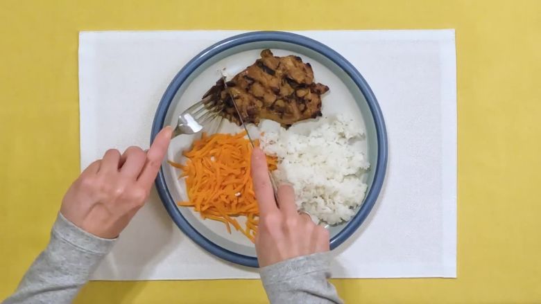 وبعد ذلك يوضع السكين على الطبق، وتنتقل الشوكة إلى اليد المسيطرة، مع توجيه أسنانها إلى الأعلى لتناول الطعام.