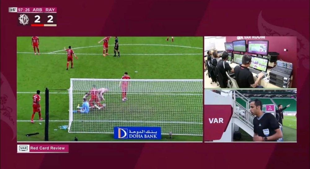 الدقيقة 90+7: قرار صحيح من الحكم بعد الاستدعاء من حكم الفيديو المساعد (VAR) بإشهار البطاقة الحمراء على لاعب فريق العربي رقم 6 لقيامه بضرب لاعب الريان رقم 6 عندما كانت الكرة خارج اللعب (السلوك المشين). التدخل يُصنف كمخالفة بسبب استخدام القوة المفرطة، ويقع ضمن الأفعال التي تستوجب الطرد المباشر وفقاً للقانون 12 من قوانين اللعبة (الأخطاء وسوء السلوك).