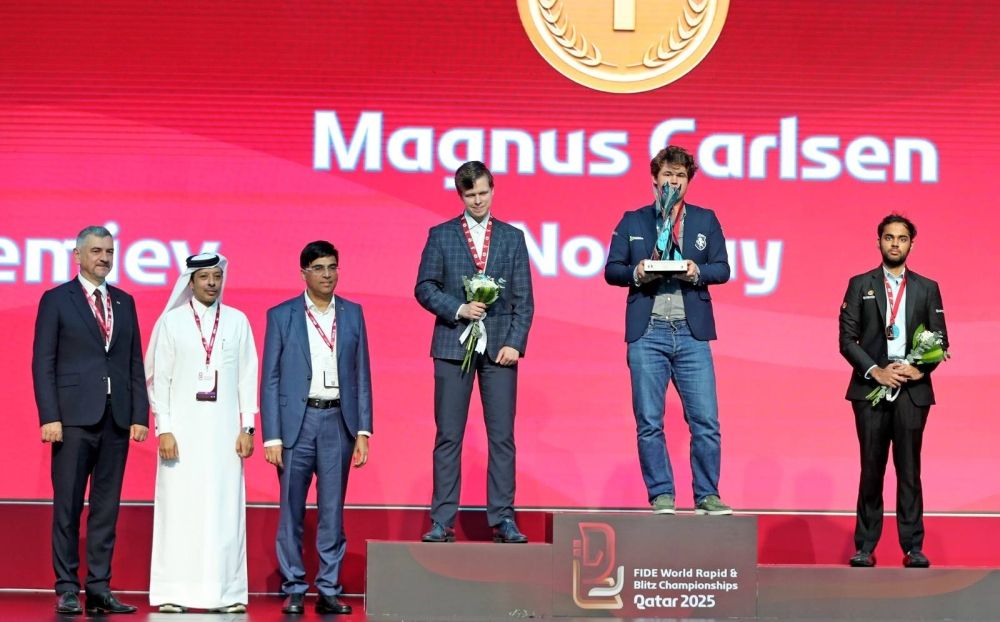 الثلاثاء 30 ديسمبر 2025 05:40 مساءً توج النرويجي ماغنوس كارلسن بلقب بطولة كأس العالم للشطرنج الخاطف قطر 2025، وذلك عقب فوزه في المباراة النهائية على الأوزبكي نودربك عبدالستاروف ليسيطر اللاعب النرويجي على لقبي الشطرنج السريع والخاطف للبطولة التي استضافها مجمع الرياضة والفعاليات في جامعة قطر.