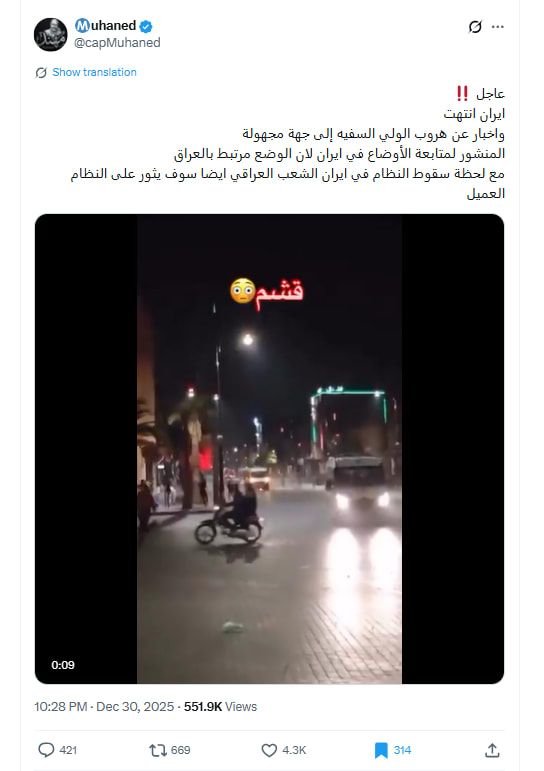 ولّد الفيديو مئات الآلاف من المشاهدات والتفاعلات، مصحوبًا بوصف مُضلل يقول: "عاجل.. إيران انتهت وأخبار عن هروب" المرشد الإيراني علي خامنئي "إلى جهة مجهولة".