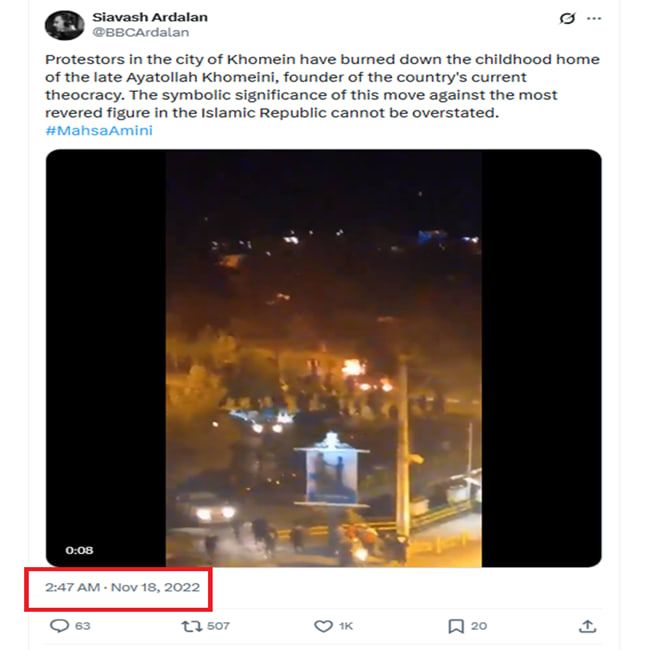 وبات الفيديو متداولا للمرة الأولى في 18 نوفمبر/تشرين الثاني 2022، بحسب نسخة منه كانت منشورة في هذا التاريخ بحساب سيافاش أردلان الصحفي في BBC فارسي.