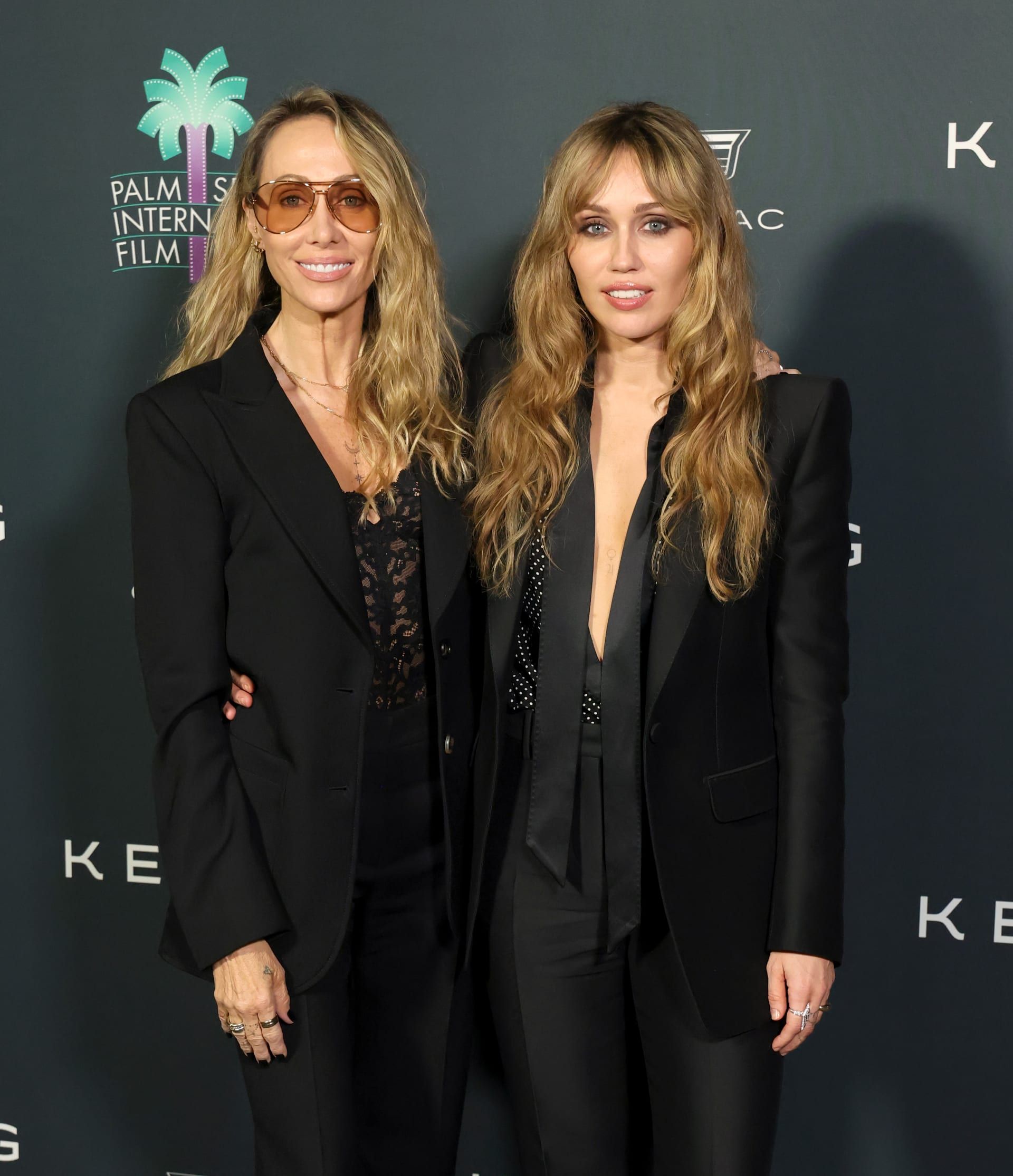 إطلالة منسّقة مع والدتها على السجّادة الحمراءسجّلت الأمسية حضورًا عائليًا لافتًا، إذ رافقت مايلي والدتها تيش سايرس، في مشهد موضة متناغم. واختارت الأم بدلة سوداء كلاسيكية نسّقتها مع بلوزة من الدانتيل، وأكملت إطلالتها بنظارات شمسية كبيرة.